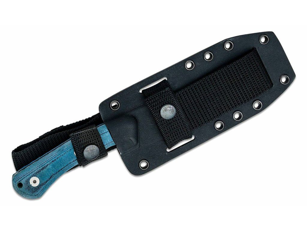 Tvarovaná rukoväť je z odolného materiálu Micarta modrej farby, s textúrovaným povrchom pre pohodlný úchop. V spodnej časti má otvor na šnúrku.