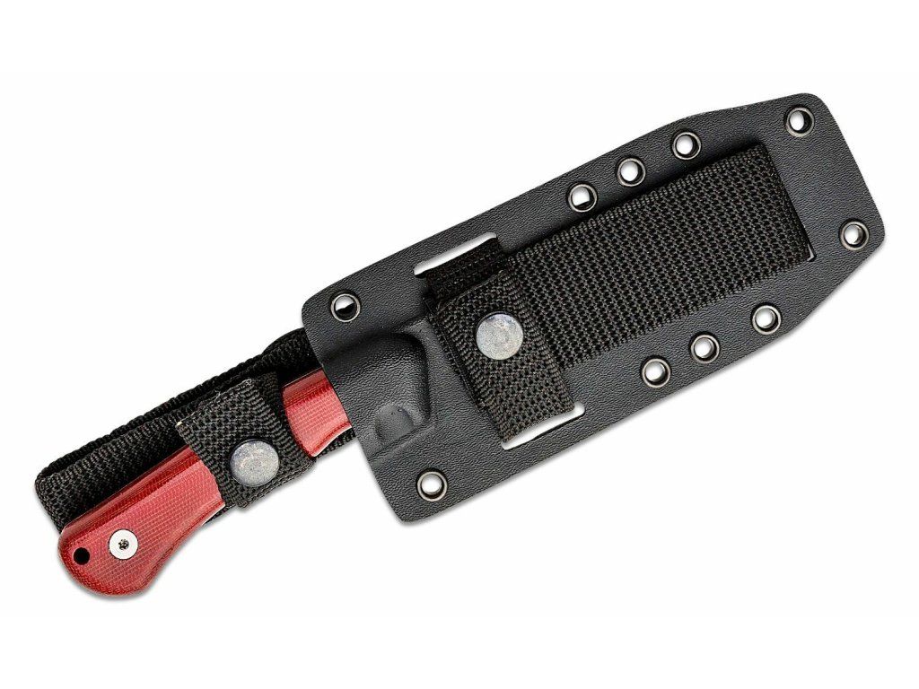 Tvarovaná rukoväť je z odolného materiálu Micarta červenej farby, s textúrovaným povrchom pre pohodlný úchop. V spodnej časti má otvor na šnúrku.