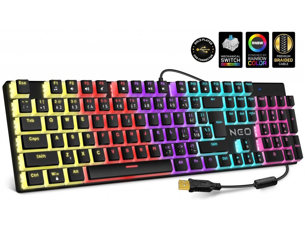 NEOPudding BLACK --- Profesionální mechanická klávesnice z řady NEO series pro hráče počítačových her v českém layoutu s celkem 12 módy barevného rainbow podsvícení a čtyřstupňovou regulací intenzity podsvícení. K dispozici je 12 multimediálních kláves. --- Kromě klasických herních funkcí, tato klávesnice disponuje mechanickými spínači s životností až 50 miliónů kliknutí. Samozřejmostí je u této série prémiový oplet přívodního kabelu a pozlacený USB konektor. --- Určena pro profesionální i amatérské hráče počítačových her CZ verze Mechanické spínače s životností až 50 miliónů kliknutí Barevné variabilní RAINBOW LED podsvícení všech kláves pro použití večer, v noci nebo obecně za zhoršených světelných podmínek 12 módů barevného podsvícení 4 stupňová regulace intenzity podsvícení ve všech 12 módech barevného podsvícení 3 stupňová regulace rychlosti rainbow efektu ve vybraných módech barevného podsvícení Možnost úplného vypnutí podsvícení 12 multimediálních kláves: - hudební přehrávač - hlasitost (snížení) - hlasitost (zvýšení) - ztlumení zvuku - stop - předchozí stopa - přehrávání/pauza - následující stopa - e-mail - web - WinLock - kalkulačka Win-Lock (uzamčení Windows klávesy při hraní her bránící nechtěné vyvolání nabídky Windows) Klasické rozložení kláves 25 Anti-ghost kláves zabraňující chybné interpretaci více stisknutých kláves Přívodní kabel s prémiovým opletem Pozlacený USB konektor pro maximální konektivitu Snadná instalace Plug & Play bez nutnosti stahování ovladačů Kompatibilní s operačními systémy Windows a Mac OS X (funkce produktu, které nejsou podporovány Mac OS X, nemusí fungovat správně) Délka přívodního kabelu: 150 cm Rozměry klávesnice (d x h x v): 423 x 118 x 38 mm Hmotnost včetně kabelu: 681 g --- Obsah balení: Klávesnice Návod k obsluzeDodatočné parametre