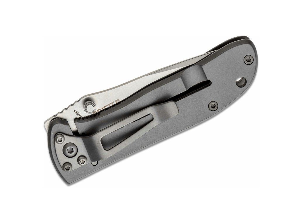 Rukoväť je z nehrdzavejúcej ocele s matnou šedou povrchovou úpravou nitridu titánu. S dierkou na šnúrku a sponou na vrecká.