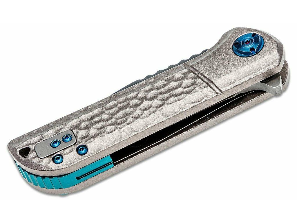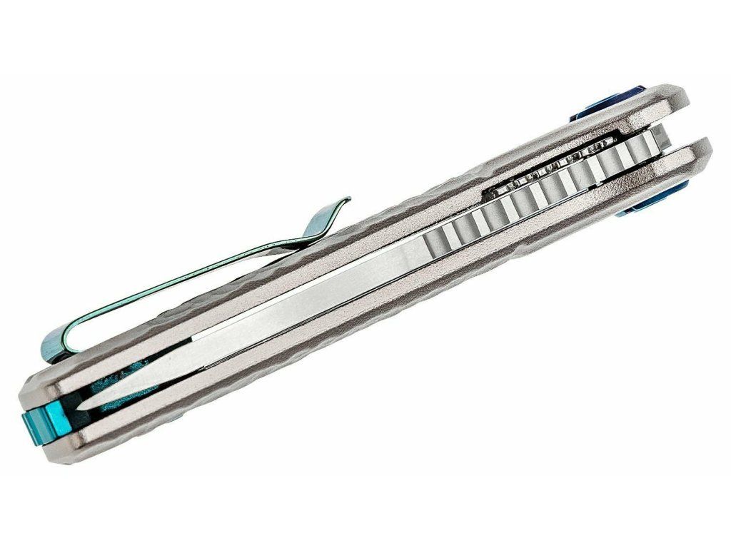 Hliníková rukoväť s nepravidelnou štruktúrou a modrými doplnkami zvýrazňuje futuristické črty. Na konci rukoväte sa nachádza otvor na šnúrku a nôž je vybavený sponou pre nosenie vo vrecku.