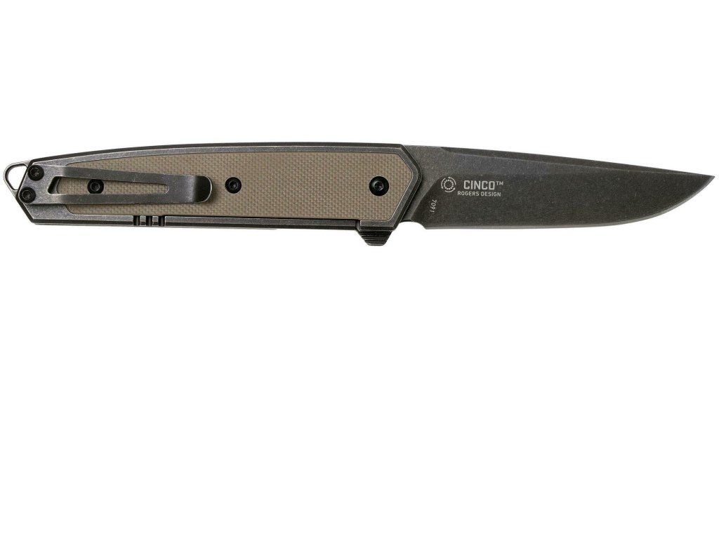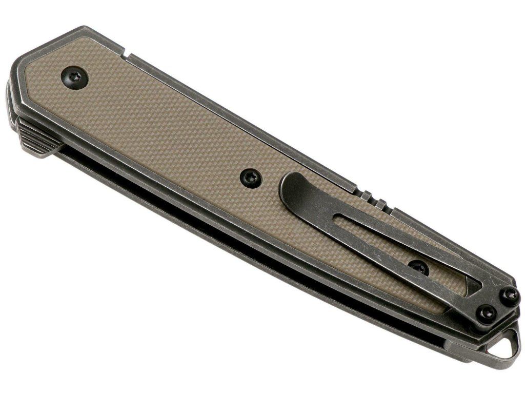 Rukoväť je z nehrdzavejúcej ocele Black Stonewash a materiálu G10 v púštnej hnedej farbe. S dierkou na šnúrku a sponou na vrecká.