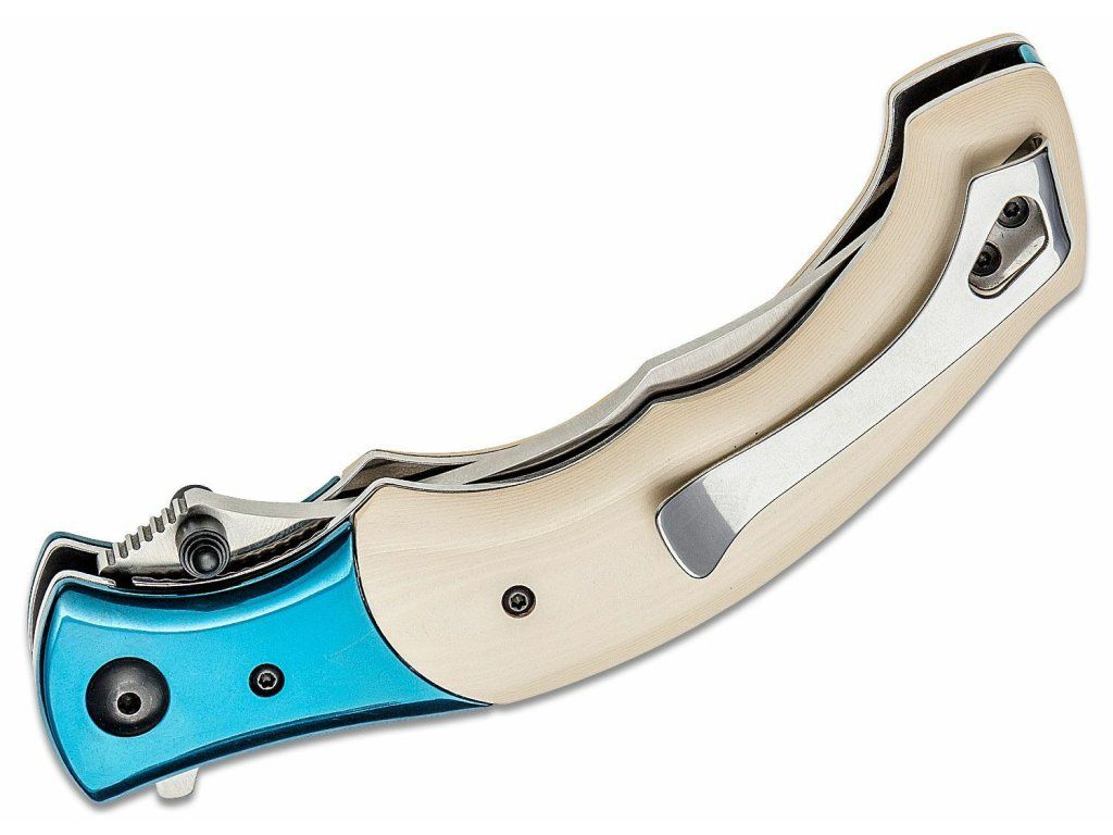Rukoväť je vyrobená zo živice a nerezovej ocele v modrej farbe, pripomína slonovinu. So sponou na vrecká.