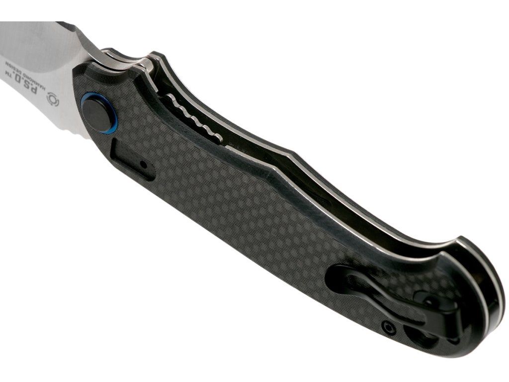 Rukoväť je z odolného G10 čiernej farby, s vrstvou uhlíkových vláken. S dierkou na šnúrku a sponou na vrecká.