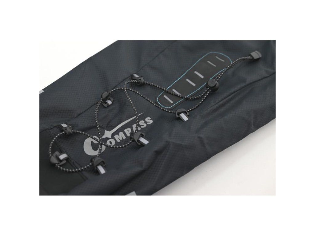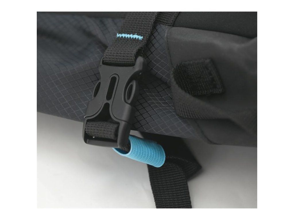 Když naplníte tašku svými věcmi, vrchní část se 3-4x zavine a zabezpečí pomocí přezek na bocích tašky. Navíc je vrchní část doplněna o gumové šněrování, které je možné využít pro uchycení dalšího vybavení.