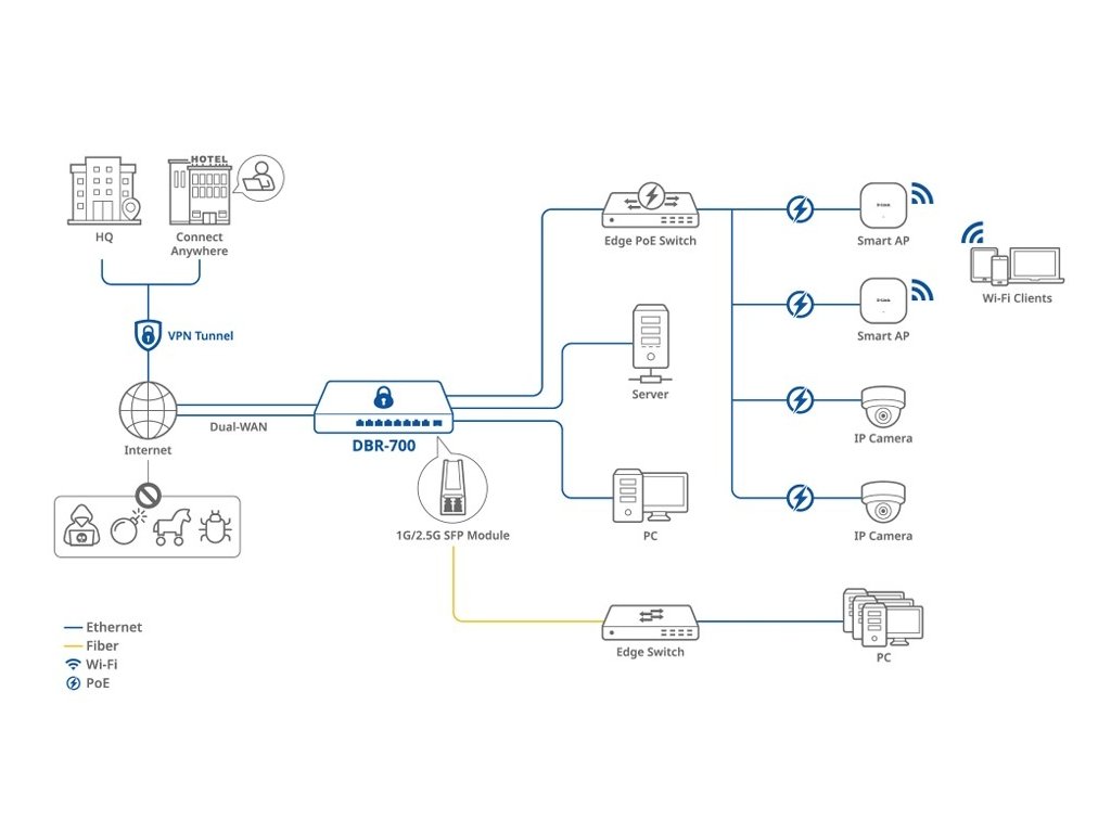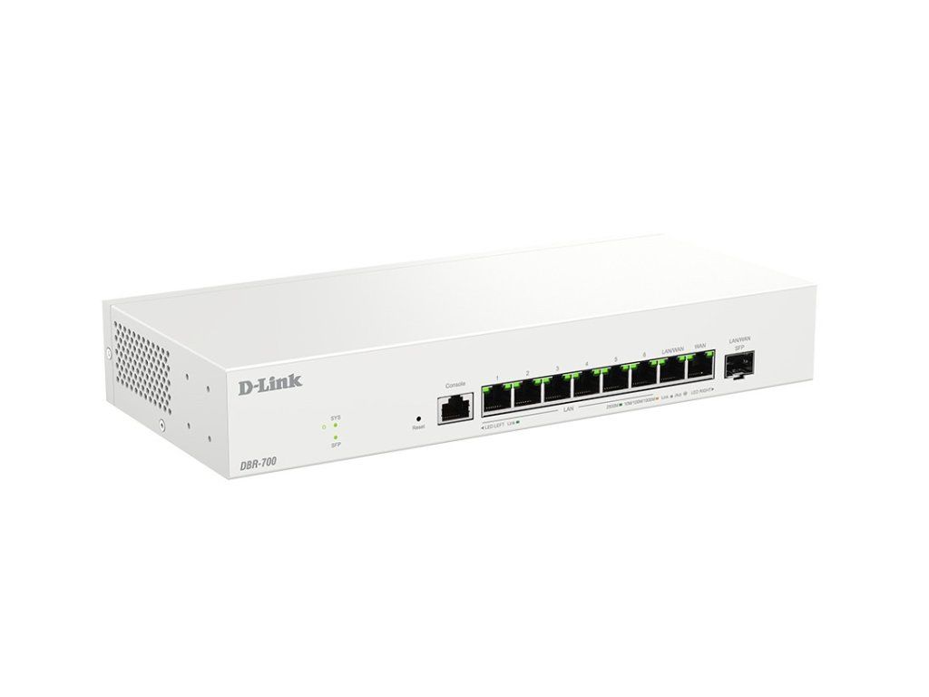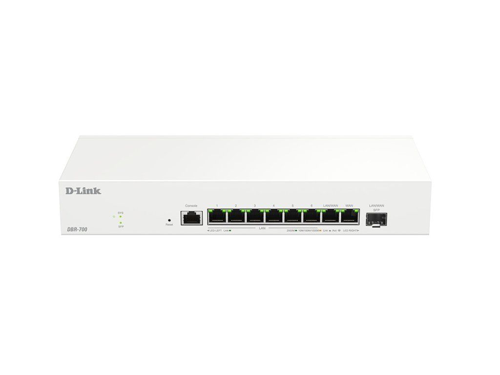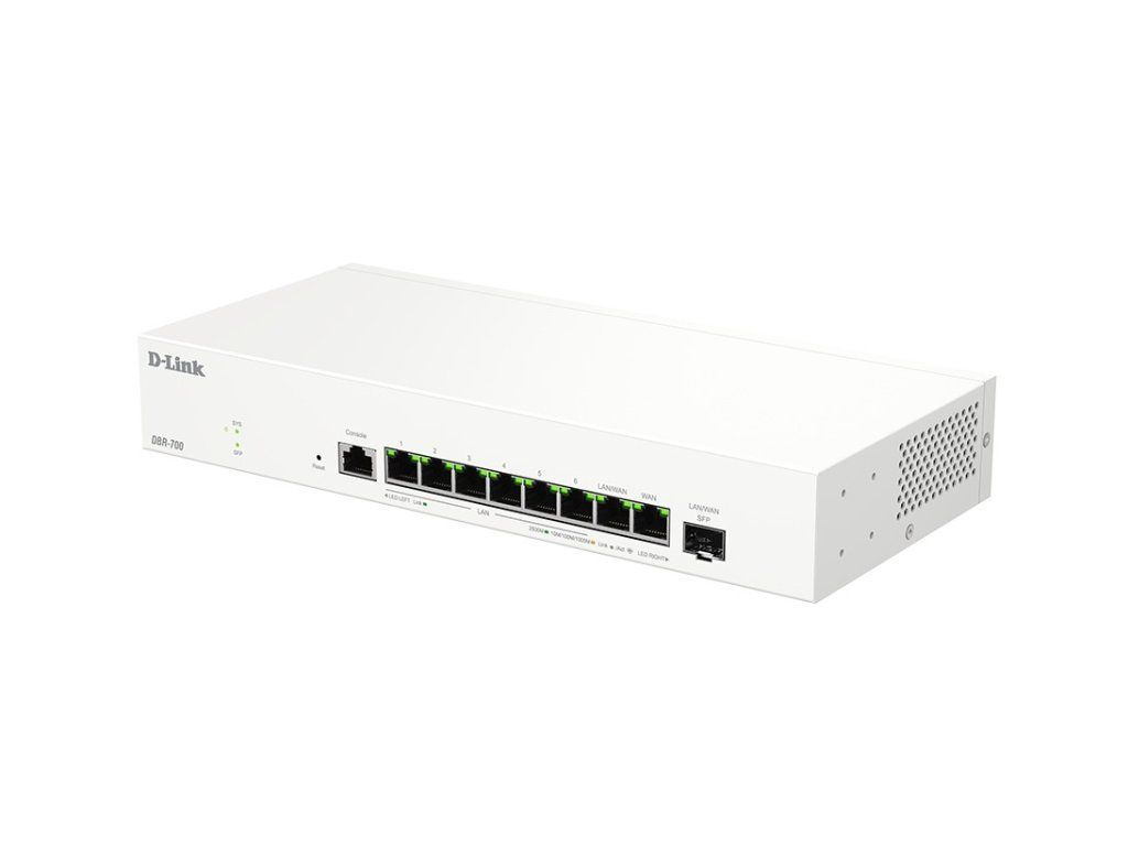 D-link DBR-700 Business router DBR-700 nabízí vysoce výkonné síťové připojení s 2,5GE WAN portem a osmi 2,5GE porty pro rychlé a spolehlivé připojení. Je ideální pro malé kanceláře a kavárny, nabízí flexibilní a dostatečnou šířku pásma pro vaši síť. Díky 2Gb/s firewallu a IPsec VPN tunelům zajišťuje bezpečný vzdálený přístup. Vestavěná správa AP zjednodušuje ovládání bezdrátových přístupových bodů, což z něj činí vynikající volbu pro firmy hledající efektivní a bezpečná síťová řešení. DBR-700 je vybaven optickým portem, díky čemuž je ideální pro připojení na velké vzdálenosti, například pro propojení odlehlých oblastí v hotelech nebo na parkovištích, a zajišťuje silný signál bez nutnosti dalšího vybavení. Základem designu řady DBR je bezpečnost a vzdálený přístup. Díky integrované podpoře VPN pro více protokolů nabízejí tyto routery bezpečné, šifrované vzdálené připojení mezi zařízeními a pobočkami. Ať už jde o hybridní práci nebo propojení více lokalit, řada DBR zajišťuje, že obchodní data zůstanou v bezpečí a přístupná. Další bezpečnostní funkce na podnikové úrovni, včetně firewallu SPI, IPS (Intrusion Prevention System) a filtrování URL, zvyšují ochranu sítě a produktivitu uživatelů. Integrované funkce bezdrátového řadiče a uživatelsky přívětivé webové rozhraní umožňují centralizovanou správu více přístupových bodů, poskytují přehled v reálném čase a zjednodušují konfiguraci. Virtuální privátní síť (VPN) zajišťuje bezpečná a soukromá připojení šifrováním dat a silným ověřováním. Vytváří bezpečný tunel mezi uživateli a sítěmi, čímž chrání citlivé informace před neoprávněným přístupem. VPN umožňují vzdálený přístup, který zaměstnancům zprostředkuje bezpečně se připojit k firemní síti z libovolného místa, a nabízejí robustní bezpečnostní funkce, jako je integrita dat a šifrování provozu, čímž zajišťují spolehlivé a bezpečné připojení. Rozhraní 2,5G na VPN routeru poskytuje ultra rychlé rychlosti až 2,5 gigabitů za sekundu, což zvyšuje výkon VPN s rychlejšími přenosy dat a nižší latencí. Podporuje více simultánních připojení, což zajišťuje plynulý, bezpečný a efektivní vzdálený přístup i při vysokém zatížení. Přidaná šířka pásma je ideální pro firmy, které potřebují spolehlivou komunikaci, přenos velkých souborů a bezproblémové videokonference, a to vše při zachování silného šifrování a zabezpečení. Inteligentní záložní přepínání dvou WAN sítí zajišťuje nepřerušované připojení k internetu automatickým přepnutím na záložní WAN připojení v případě selhání primárního. Tato funkce zvyšuje spolehlivost sítě a udržuje konzistentní služby, čímž minimalizuje prostoje kritických operací. Zároveň vyvažuje provoz mezi oběma WAN připojeními, optimalizuje šířku pásma a zlepšuje výkon. Díky tomuto systému se organizace mohou spolehnout na robustní zálohu, která zvládne případné výpadky. Vyvažování zátěže WAN (WAN Load Balancing) rozděluje provoz mezi více WAN připojení, čímž zvyšuje výkon a spolehlivost. Optimalizují rychlost a zajišťují plynulý přenos dat pro aplikace s vysokou šířkou pásma tím, že zabraňují přetížení jakéhokoli jednotlivého připojení. Navíc poskytují záložní připojení pro redundanci, udržují kontinuitu v případě výpadků a umožňují nepřerušovaný provoz. Porty SFP (Small Form-Factor Pluggable) poskytují univerzální vysokorychlostní optické připojení, které je ideální pro přenos dat na velké vzdálenosti. Podporují různé typy optických kabelů, což umožňuje sítím přizpůsobovat se měnícím se potřebám při zachování rychlosti, stability a škálovatelnosti. Díky této flexibilitě jsou porty SFP robustním řešením pro datová centra, podnikové sítě a profesionální audiovizuální systémy, které umožňují spolehlivější a výkonnější připojení. Port DBR-700 SFP je kompatibilní pouze s moduly 1G/2,5G SFP. Robustní zabezpečení firewallu lépe chrání vaši síť před neoprávněným přístupem a kybernetickými hrozbami. Zahrnuje pokročilé funkce, jako jsou systémy detekce a prevence narušení (IDS/IPS), filtrování URL a kontrola stavových paketů (SPI). Díky monitorování v reálném čase a automatickému zmírňování hrozeb poskytuje větší ochranu citlivých dat a udržuje bezpečné síťové prostředí pro všechna připojená zařízení. Inteligentní přístupový bod (DBR-3000-AP) je spravován prostřednictvím podnikového routeru (DBR-700) a ovládán prostřednictvím jednotného ovládacího panelu, což poskytuje centralizovaný přístup ke správě sítě. Prostřednictvím intuitivního webového uživatelského rozhraní DBR-700 centrálně monitoruje stav celé sítě a snadno spravuje konfiguraci pokročilých funkcí. Toto nastavení zjednodušuje konfiguraci, monitorování a řízení síťových nastavení, čímž zefektivňuje administrativní úkoly. Zajišťuje důsledné prosazování zásad a zároveň nabízí přehled o aktivitě v síti v reálném čase, což v konečném důsledku zvyšuje celkovou efektivitu a zabezpečení. * funkce zabezpečené VPN - VPN poskytuje bezpečné, šifrované připojení pro bezpečnější vzdálený přístup * vysokorychlostní port 2,5G WAN - porty 2,5G WAN poskytují vysokorychlostní připojení pro rychlý přenos dat a spolehlivý přístup pro náročné aplikace * připojení Multi-WAN k více WAN sítím - inteligentní failover - funkce Multi-WAN zajišťuje nepřetržité připojení přepnutím na záložní síť WAN v případě selhání primární sítě, čímž zvyšuje spolehlivost a konzistenci slu
