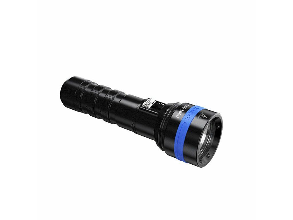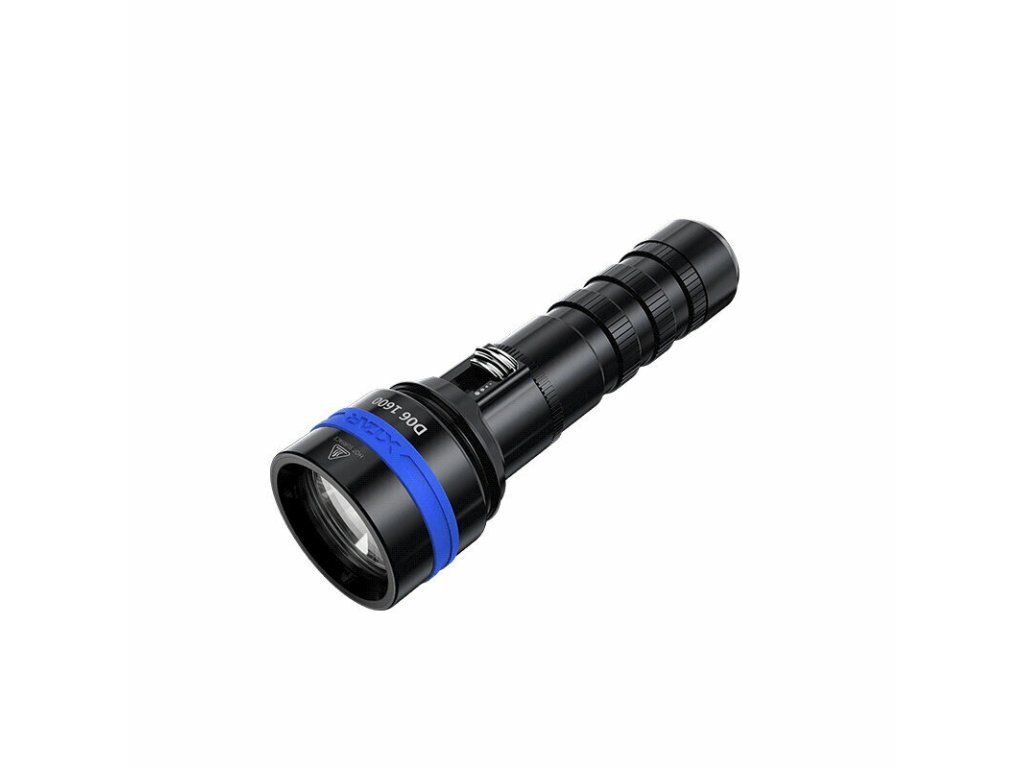 Vodotesná LED baterka/svietidlo XTAR D06-1600 vhodná pre potápačov, je osadná LED diódou Cree XHP35 D4 s max výkonom 1600 lm a dosvitom 430 metrov (na súši) a studeným odtieňom bieleho svetla 6500, aby bolo jasné svetlo vidno aj pod hladinou.