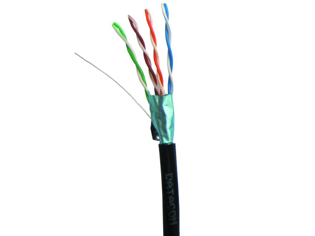 DATACOM FTP drát CAT5E 100m OUTDOOR Venkovní kabel FTP stíněný Cat5e černý, 4 páry žil, chráněn proti UV záření, proti extrémním teplotám: -20 až+ 70 °C, balení 100m návin bez cívky stažený folií PŘEHLED Instalační kabel DATACOM určený pro venkovní instalace strukturované kabeláže. Kabel je určen pro náročnější instalace, kde klasický datový kabel neposkytuje dostatečnou ochranu proti vlivům okolního prostředí. Vlastnosti PE pláště poskytují lepší odolnost proti vlivům počasí a kabel má delší životnost v náročnějších podmínkách. • 4 x 2 x 0,5 z plné mědi • typ vodiče: drát • cat.5e • 24 AWG • PE plášť • 100 m role • stíněné provedení • rozměry: 36 x 21 x 36 cm • barva černá • teplota prostředí: -20C až +70CDodatočné parametre