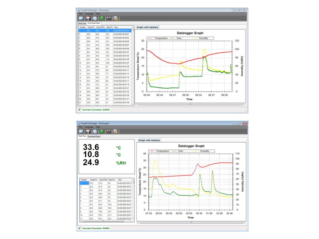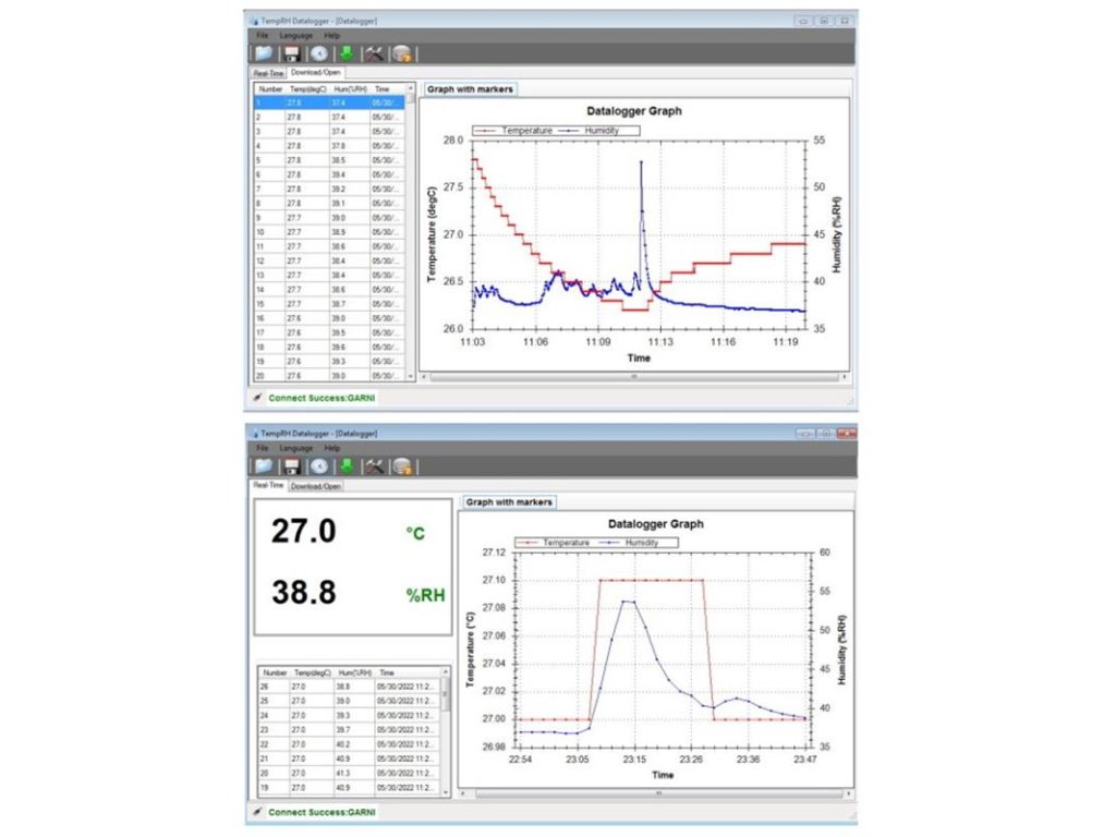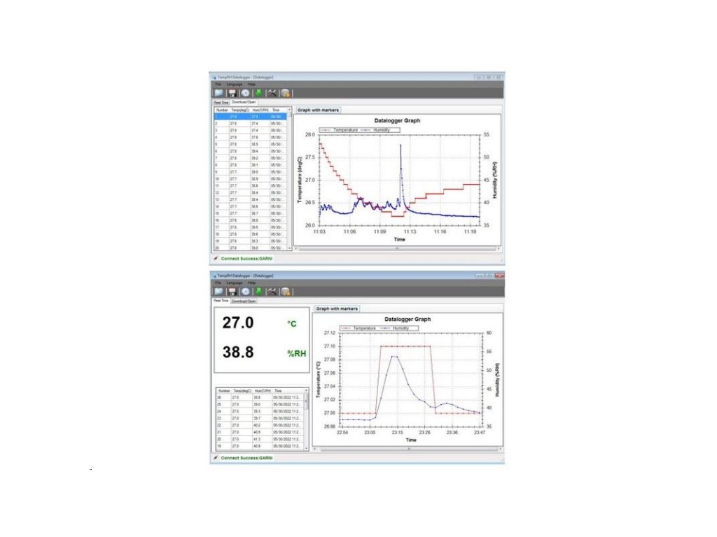 - softvér TempRH Datalogger V2.2 na zobrazovanie nameraných hodnôt, na sťahovanie údajov, nastavenie dataloggeru grafov