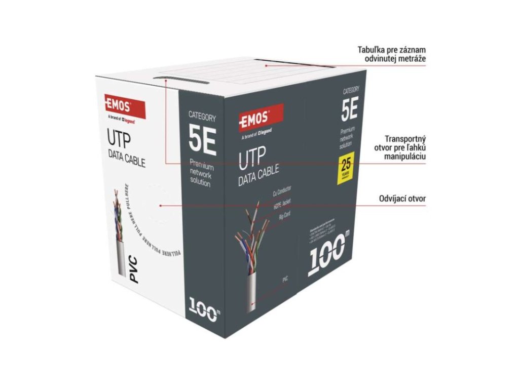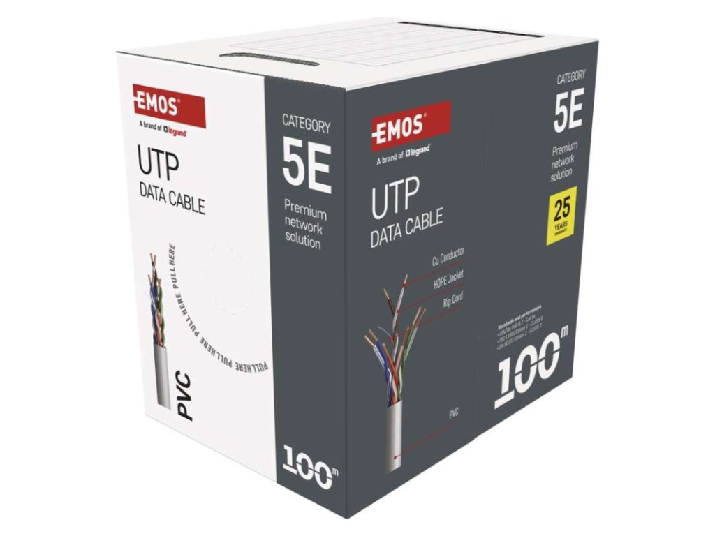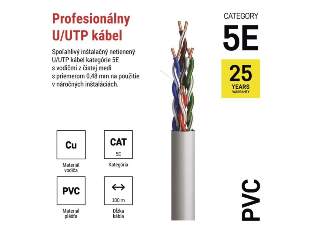 AWG: 24|dĺžka: 100 m|farba plášťa: sivá (RAL 7035)|hrúbka izolácie vodičov: 0,22 mm|hrúbka plášťa: 1,0 mm|izolácia vodičov: HDPE|kategória: CAT5E|konštrukcia kábla: drôt|materiál vnútorného vodiča: meď (Cu)|maximálna prevádzková vlhkosť: 93 %|montážna teplota: +5 °C až +60 °C|najvyšší podporovaný protokol: 1000 Base-TX (Gigabit Ethernet)|nebezpečné látky: žiadne|osadené konektory: neuvádza sa|plášť kábla: PVC|plášť so zníženou dymivosťou LSZH (LS0H): nie|počet vodičov: 8|použitie: professional|predajný obal: 100 m, papierová krabica|priemer kábla: 5 mm|priemer vnútorného vodiča: 0,48 mm|produkt: UTP kábel bez konektorov|skladovacia teplota: -20 °C až +60 °C|ťahový prvok: neuvádza sa|tienenie: nie|trieda reakcie na oheň: Eca|typ: UTP CAT 5E PVC|typ ochrany konektorov: neuvádza sa|určené pre kábel: neuvádza sa|záručná doba: 25 rokov|značenie kábla: UTP Cat5E PVC 1 – 100 mDodatočné parametre