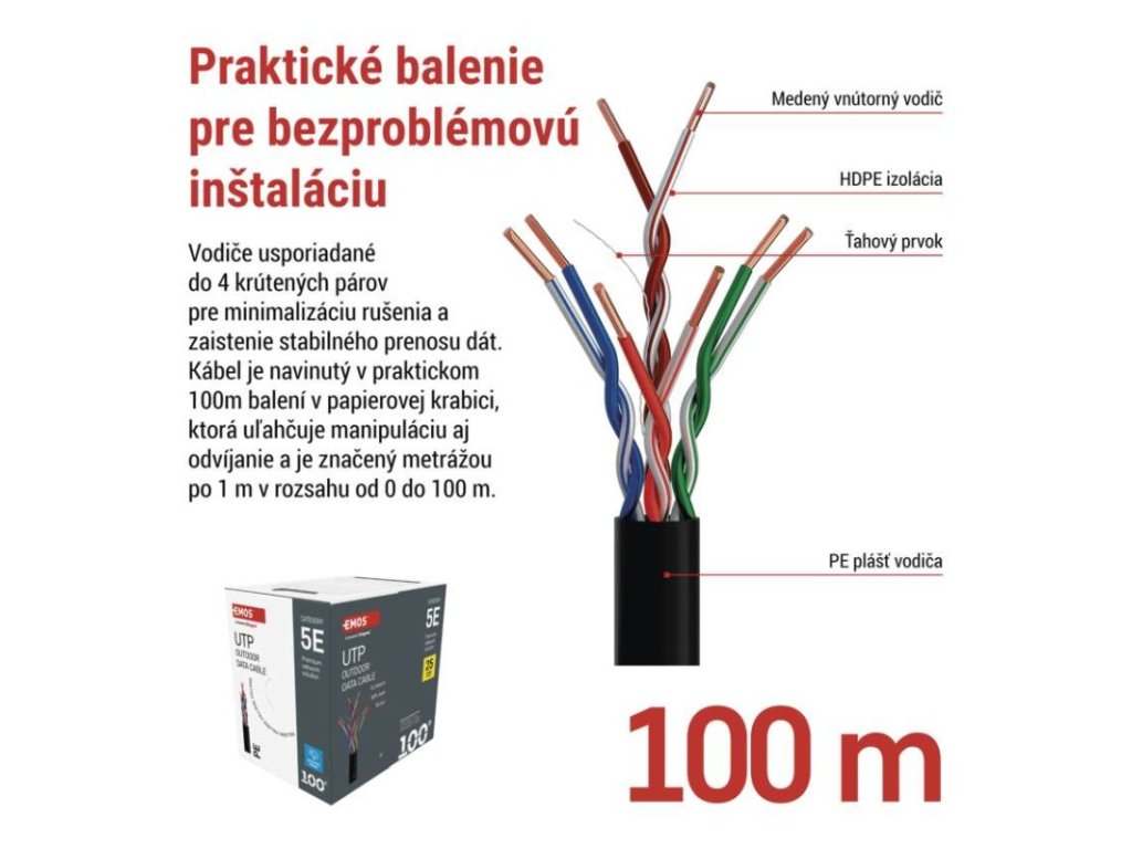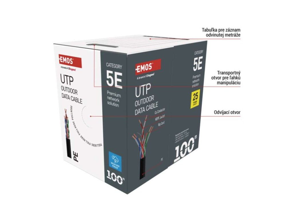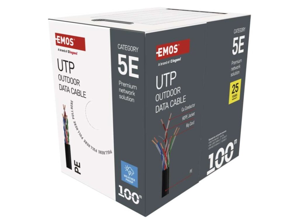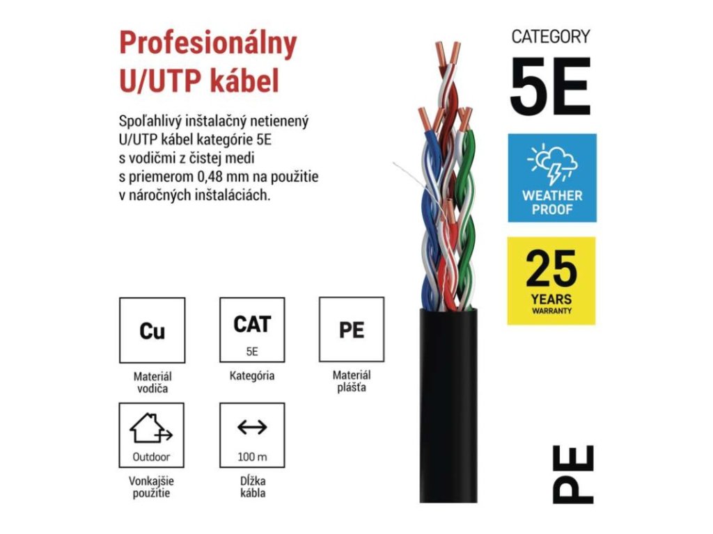 AWG: 24|dĺžka: 100 m|farba plášťa: čierna (RAL 9005)|hrúbka izolácie vodičov: 0,22 mm|hrúbka plášťa: 1,0 mm|izolácia vodičov: HDPE|kategória: CAT5E|konštrukcia kábla: drôt|materiál vnútorného vodiča: meď (Cu)|maximálna prevádzková vlhkosť: 93 %|montážna teplota: +5 °C až +60 °C|najvyšší podporovaný protokol: 1000 Base-TX (Gigabit Ethernet)|nebezpečné látky: žiadne|osadené konektory: nie|plášť kábla: PE|plášť so zníženou dymivosťou LSZH (LS0H): nie|počet vodičov: 8|použitie: professional|predajný obal: 100 m, papierová krabica|priemer kábla: 5 mm|priemer vnútorného vodiča: 0,48 mm|produkt: UTP kábel bez konektorov|skladovacia teplota: -20 °C až +60 °C|ťahový prvok: –|tienenie: nie|trieda reakcie na oheň: Eca|typ: UTP CAT 5E PE|typ ochrany konektorov: –|určené pre kábel: –|záručná doba: 25 rokov|značenie kábla: UTP Cat5E PE OUTDOOR 1 – 100 mDodatočné parametre