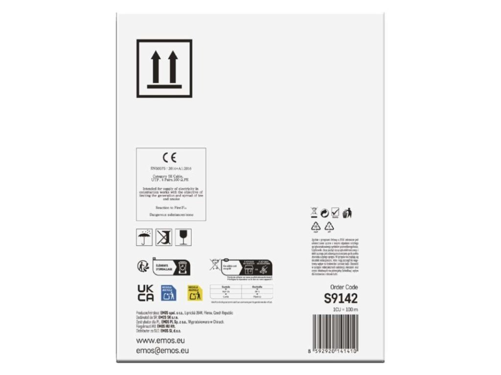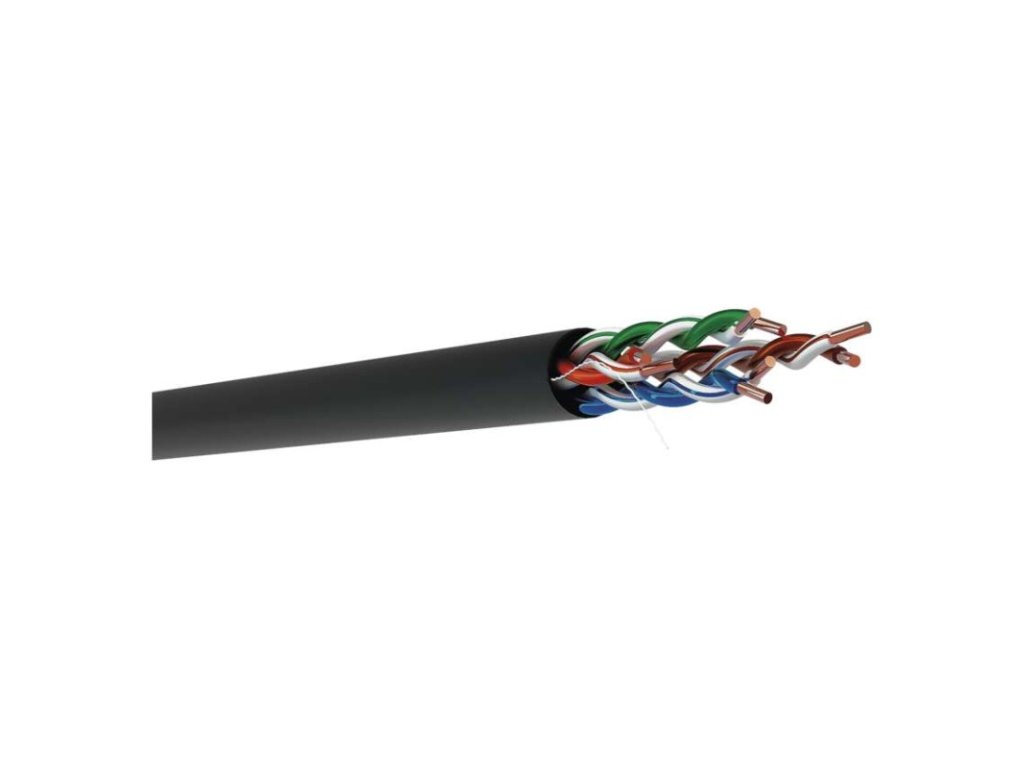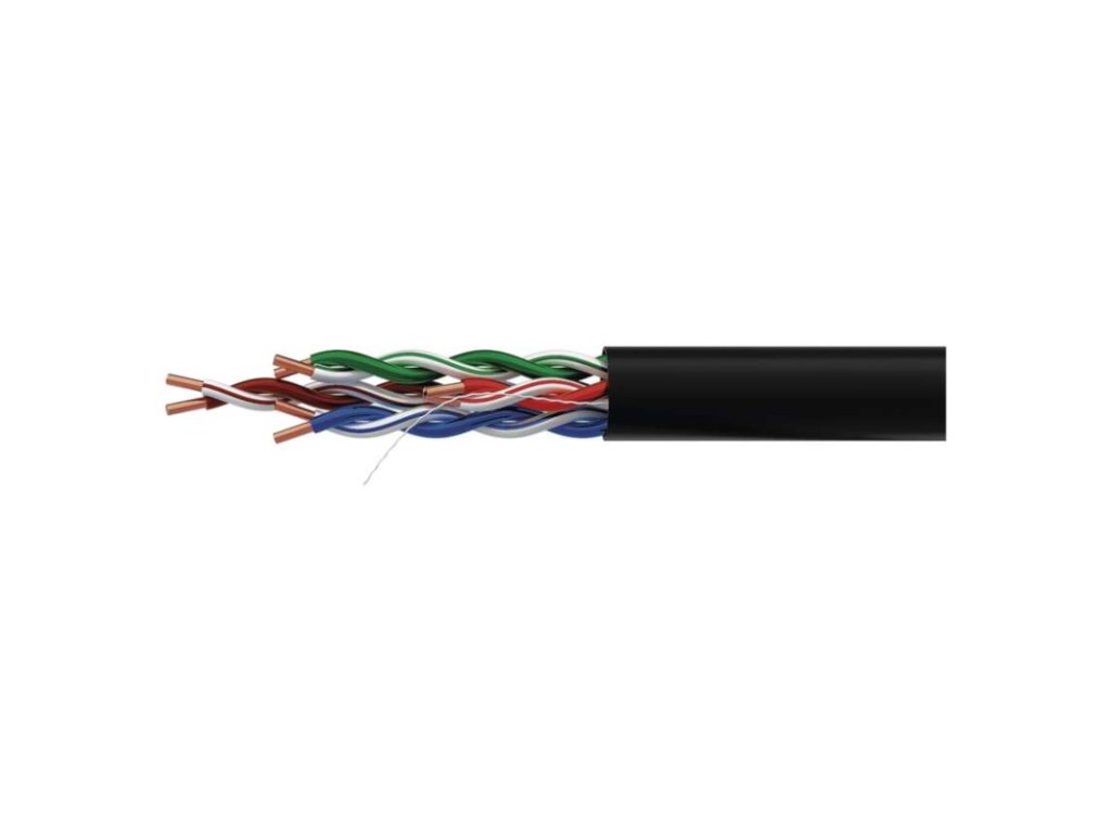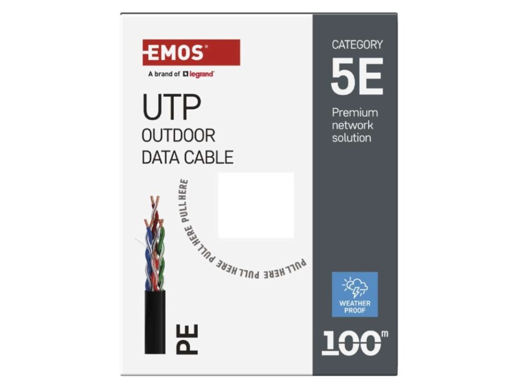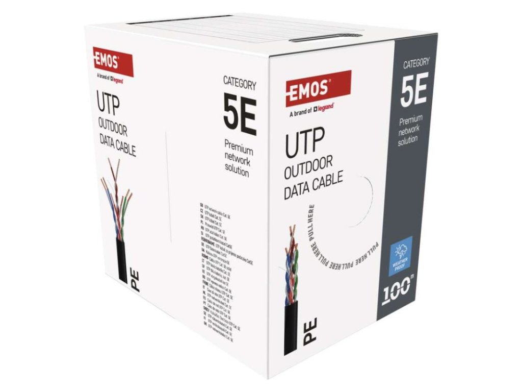 AWG: 24|dĺžka: 100 m|farba plášťa: čierna (RAL 9005)|hrúbka izolácie vodičov: 0,22 mm|hrúbka plášťa: 1,0 mm|izolácia vodičov: HDPE|kategória: CAT5E|konštrukcia kábla: drôt|materiál vnútorného vodiča: meď (Cu)|maximálna prevádzková vlhkosť: 93 %|montážna teplota: +5 °C až +60 °C|najvyšší podporovaný protokol: 1000 Base-TX (Gigabit Ethernet)|nebezpečné látky: žiadne|osadené konektory: nie|plášť kábla: PE|plášť so zníženou dymivosťou LSZH (LS0H): nie|počet vodičov: 8|použitie: professional|predajný obal: 100 m, papierová krabica|priemer kábla: 5 mm|priemer vnútorného vodiča: 0,48 mm|produkt: UTP kábel bez konektorov|skladovacia teplota: -20 °C až +60 °C|ťahový prvok: –|tienenie: nie|trieda reakcie na oheň: Eca|typ: UTP CAT 5E PE|typ ochrany konektorov: –|určené pre kábel: –|záručná doba: 25 rokov|značenie kábla: UTP Cat5E PE OUTDOOR 1 – 100 mDodatočné parametre