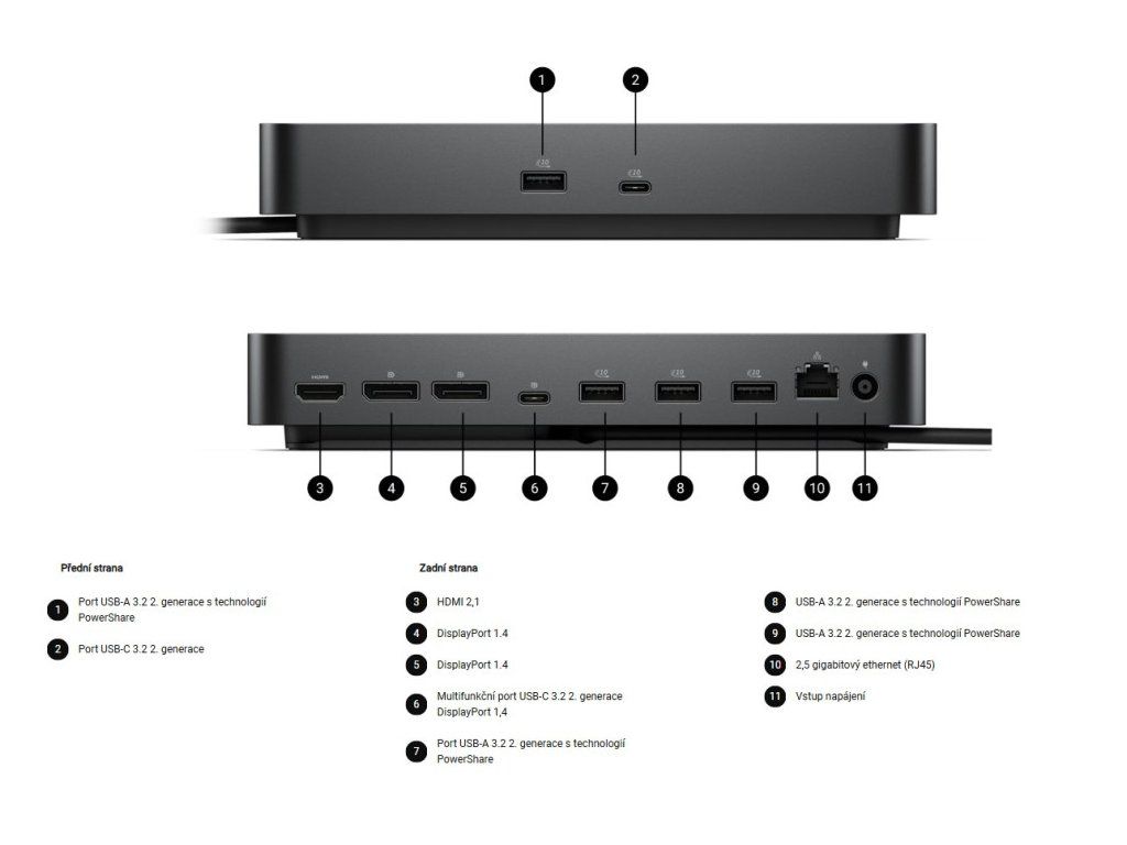 Technické parametry * Technologie připojení: Drátové * Počet podporovaných displejů: 4 * Podporované zařízení: Notebook * Technologie Ethernet: RJ45 Ethernetový port, 1GbE * Napájení USB: 130 W (systémy Dell), 96 W (systémy jiných výrobců než Dell) * Maximální výkon zdroje napájení: 180 W Funkce správy * Správa hostitelského počítače - Předávání MAC adres - Spouštění PXE - Synchronizace tlačítka napájení doku - Probuzení v síti LAN - Přepínač WLAN na LAN - Ochrana přímého přístupu do paměti jádra (DMA) Funkce správy doků - Vzdálené aktualizace firmwaru bez PC - Aktualizace firmwaru na bázi hostitelského PC - Aktualizace firmwaru při odpojení - Zakázání portů nezávislé na PC Rozlišení videa * DP1.4 s kompresí Display Stream 4x WQHD (3440 x 1440) @ 60 Hz 3x WQHD (3440 x 1440) @ 60 Hz 2x 5K (5120 x 2160) @ 60Hz 1x 6K (6144 x 3456) @ 60Hz * DP1.4 bez komprese Display Stream Až k: 4x HD (1280 x 720) @ 60Hz 3x FHD (1920 x 1080) @ 60Hz 2x QHD (2560 x 1440) @ 60Hz 1x 4K (3840 x 2160) @ 60Hz Rozhraní/porty Rozhraní hostitele * Video rozhraní 2x DP1.4 1x HDMI 2.1 1x USB-C 3.2 Gen 2 multifunkční DisplayPort 1.4 * Porty USB (pouze data) 4x USB-A 3.2 Gen 2 (10 Gbps) 1x USB-C 3.2 Gen 2 (10 Gbps) * Porty USB (napájení) 4x USB-A 3.2 Gen 2 (4,5 W každý) 1x USB-C 3.2 Gen 2 (15 W) 1× multifunkční rozhraní USB-C DisplayPort (7,5 W) Všechny dodávají energii s počítačem nebo bez něj Rozměry * Výška: 205mm * Šířka: 90mm * Hloubka: 35,25mm * Hmotnost (přibližná): 562 g Obsah balení Dokovací stanice Napájecí adaptér a napájecí kabel Dokumentace (Příručka pro rychlý start, informace o bezpečnosti, životním prostředí a předpisech) Kompatibilita Dell Plus DB16255 Dell Pro PC14250 Dell Pro PC16250 Dell Pro PC14255 Dell Pro PC14255 Dell Pro Premium PA13250 Dell Pro Premium PA14250 Dell Pro Plus PB13250 Dell Pro Plus PB14250 Dell Pro Plus PB16250 Dell Pro Plus PB13255 Dell Pro Plus PB14255 Dell Pro Plus PB16255 Dell Pro Max MC14250 Dell Pro Max MC16250 Dell Pro Max MC14255 Dell Pro Max MC16255 Dell Pro Rugged RA13250 Dell Pro Rugged RA14250 Inspiron 5441 Inspiron 7441 Latitude 3140 Latitude 3330 Latitude 3340 Latitude 3430 Latitude 3440 Latitude 3445 Chrome Latitude 3450 Latitude 3530 Latitude 3540 Latitude 3550 Latitude 5330 Latitude 5330 2v1 Latitude 5340 Latitude 5340 2v1 Latitude 5350 Latitude 5350 2v1 Latitude 5430 Latitude 5430 Chromebook Enterprise Latitude 5431 Latitude 5440 Latitude 5450 Latitude 5455 Latitude 5530 Latitude 5531 Latitude 5540 Latitude 5550 Latitude 7230 Rugged Latitude 7320 Detachable Latitude 7330 Latitude 7340 Latitude 7340 2v1 Latitude 7350 Latitude 7350 2v1 Latitude 7350 2v1 Detachable Latitude 7430 Latitude 7440 Latitude 7440 2v1 Latitude 7450 Latitude 7450 2v1 Latitude 7455 Latitude 7530 Latitude 7640 Latitude 7650 Latitude 9330 2v1 Latitude 9430 Latitude 9440 2v1 Latitude 9450 2v1 Precision 3470 Precision 3480 Precision 3490 Precision 3570 Precision 3571 Precision 3580 Precision 3581 Precision 3590 Precision 3591 Precision 5470 Precision 5480 Precision 5490 Precision 5570 Precision 5680 Precision 5690 Precision 5770 Precision 7670 Precision 7680 Precision 7770 Precision 7780 XPS 9315 XPS 9315 2v1 XPS 9320 XPS 9340 XPS 9345 XPS 9350 XPS 9440 XPS 9520 XPS 9530 XPS 9720 XPS 9730Dodatočné parametre