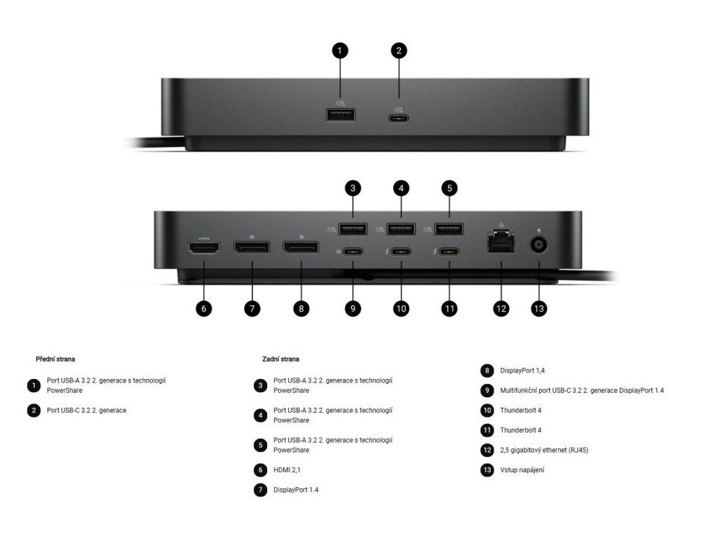 Technické parametry Technologie připojení: Drátové Počet podporovaných displejů: 4 Podporované zařízení: Notebook Technologie Ethernet: RJ45 Ethernetový port, 1GbE Napájení USB: 130 W (systémy Dell), 96 W (systémy jiných výrobců než Dell) Maximální výkon zdroje napájení: 180 W Funkce správy Správa hostitelského počítače - Intel® AMT přes Thunderbolt™ s vybranými počítači Intel® vPro® - Předávání MAC adres - Spouštění PXE - Synchronizace tlačítka napájení doku - Probuzení v síti LAN - Přepínač WLAN na LAN - Ochrana přímého přístupu do paměti jádra (DMA) Funkce správy doků - Vzdálené aktualizace firmwaru bez PC - Aktualizace firmwaru na bázi hostitele - Aktualizace firmwaru při odpojení - Zakázání portů nezávislé na PC Rozlišení videa DP1.4 / DP2.1 s kompresí Display Stream 4x 4K (3840 x 2160) @ 60Hz 3x 4K (3840 x 2160) @ 60Hz 2x 6K (6144 x 3456) @ 60Hz 1x 8K (7680 x 4320) @ 60Hz DP1.4 bez komprese Display Stream až k: 4x QHD (2560 x 1440) @ 60Hz 3x WQHD (3440 x 1440) @ 60 Hz 2x 4K (3840 x 2160) @ 60Hz 1x 5K WUHD (5120 x 2160) @ 60Hz Rozhraní/porty Rozhraní hostitele Video rozhraní 2 x DP1.4 1 x HDMI 2.1 1 x USB-C 3.2 Gen 2 multifunkční DisplayPort 1.4 2 x Thunderbolt 4 Porty USB (pouze data) 4 x USB-A 3.2 Gen 2 (10 Gbps) 1 x USB-C 3.2 Gen 2 (10 Gbps) Porty USB (napájení) 4 x USB-A 3.2 Gen 2 (4,5 W každý) 1 x USB-C 3.2 Gen 2 (15 W) 1 × multifunkční rozhraní USB-C DisplayPort (7,5 W) 2 x Thunderbolt 4 (15 W každý) Všechny dodávají energii s počítačem nebo bez něj Rozměry Výška: 205mm Šířka: 90mm Hloubka: 35,3mm Hmotnost (přibližná): 579g Obsah balení Dokovací stanice Napájecí adaptér a napájecí kabel Dokumentace (Příručka pro rychlý start, informace o bezpečnosti, životním prostředí a předpisech) Kompatibilita Dell Pro PC14250 Dell Pro PC16250 Dell Pro PC14255 Dell Pro PC14255 Dell Pro Plus PB13250 Dell Pro Plus PB14250 Dell Pro Plus PB16250 Dell Pro Plus PB13255 Dell Pro Plus PB14255 Dell Pro Plus PB16255 Dell Pro Premium PA13250 Dell Pro Premium PA14250 Dell Pro Max MC14250 Dell Pro Max MC16250 Dell Pro Max MC14255 Dell Pro Max MC16255 Dell Pro Rugged RA13250 Dell Pro Rugged RA14250 Dell 14 Plus DB14250 Dell 16 Plus DB16250 Dell 16 Plus DB06250 2v1 Inspiron 7440 Inspiron 7640 Inspiron 7640 2v1 Latitude 3140 Latitude 3330 Latitude 3340 Latitude 3430 Latitude 3440 Latitude 3445 Chrome Latitude 3450 Latitude 3530 Latitude 3540 Latitude 3550 Latitude 5330 Latitude 5330 2v1 Latitude 5340 Latitude 5340 2v1 Latitude 5350 Latitude 5350 2v1 Latitude 5430 Latitude 5430 Chromebook Enterprise Latitude 5431 Latitude 5440 Latitude 5450 Latitude 5455 Latitude 5530 Latitude 5531 Latitude 5540 Latitude 5550 Latitude 7230 Rugged Latitude 7320 Detachable Latitude 7330 Latitude 7340 Latitude 7340 2v1 Latitude 7350 Latitude 7350 2v1 Latitude 7350 2v1 Detachable Latitude 7430 Latitude 7440 Latitude 7440 2v1 Latitude 7450 Latitude 7450 2v1 Latitude 7455 Latitude 7530 Latitude 7640 Latitude 7650 Latitude 9330 2v1 Latitude 9430 Latitude 9440 2v1 Latitude 9450 2v1 Precision 3470 Precision 3480 Precision 3490 Precision 3570 Precision 3571 Precision 3580 Precision 3581 Precision 3590 Precision 3591 Precision 5470 Precision 5480 Precision 5490 Precision 5570 Precision 5680 Precision 5690 Precision 5770 Precision 7670 Precision 7680 Precision 7770 Precision 7780 XPS 9315 XPS 9315 2v1 XPS 9320 XPS 9340 XPS 9345 XPS 9350 XPS 9440 XPS 9520 XPS 9530 XPS 17 9720 XPS 17 9730Dodatočné parametre
