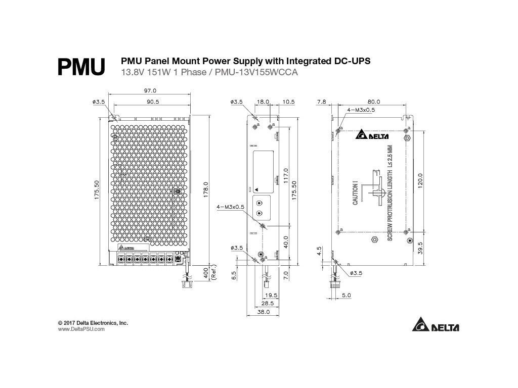 Delta PMU-13V155WCCA je záložní zdroj s výstupním napětím 13 V (12 - 14 V DC) a výkonem cca 151 W. Zařízení se vyznačuje vysokou účinností a spolehlivostí. V případě výpadku napájení se UPS automaticky přepne na bateriové napájení. Výrobek má četné ochrany: proti hlubokému vybití proti přepólování baterie proti příliš vysokému napětí proti přetížení nebo proti příliš vysoké teplotě. Napájecí zdroj umožňuje zvolit nabíjecí proud baterie, rozsah je: 0,5 - 1,5 A. Nabízený produkt má dvě LED indikující napájení (DC OK - zelená) a reverzní připojení baterie (červená), dále umožňuje připojit LED indikující AC napájení a nízké nabití baterie. Napájecí zdroj splňuje četné bezpečnostní normy, vyznačuje se rychlou dobou přepnutí ze střídavého na stejnosměrný proud. Na zařízení se vztahuje záruka 5 let. Nejdůležitější vlastnosti: - výstupní napětí - asi 13 V (12 - 14 V); - výstupní výkon - 151W; - nastavení nabíjecího proudu baterie - 0,5 - 1,5 A; - ochrana proti hlubokému vybití; - napájecí zdroj splňuje četné bezpečnostní normy; PS: pokud chcete nastartovat zdroj z akumulátoru, musíte impulzně zkratovat V+ s B+ (ne trvale!!!)Dodatočné parametre