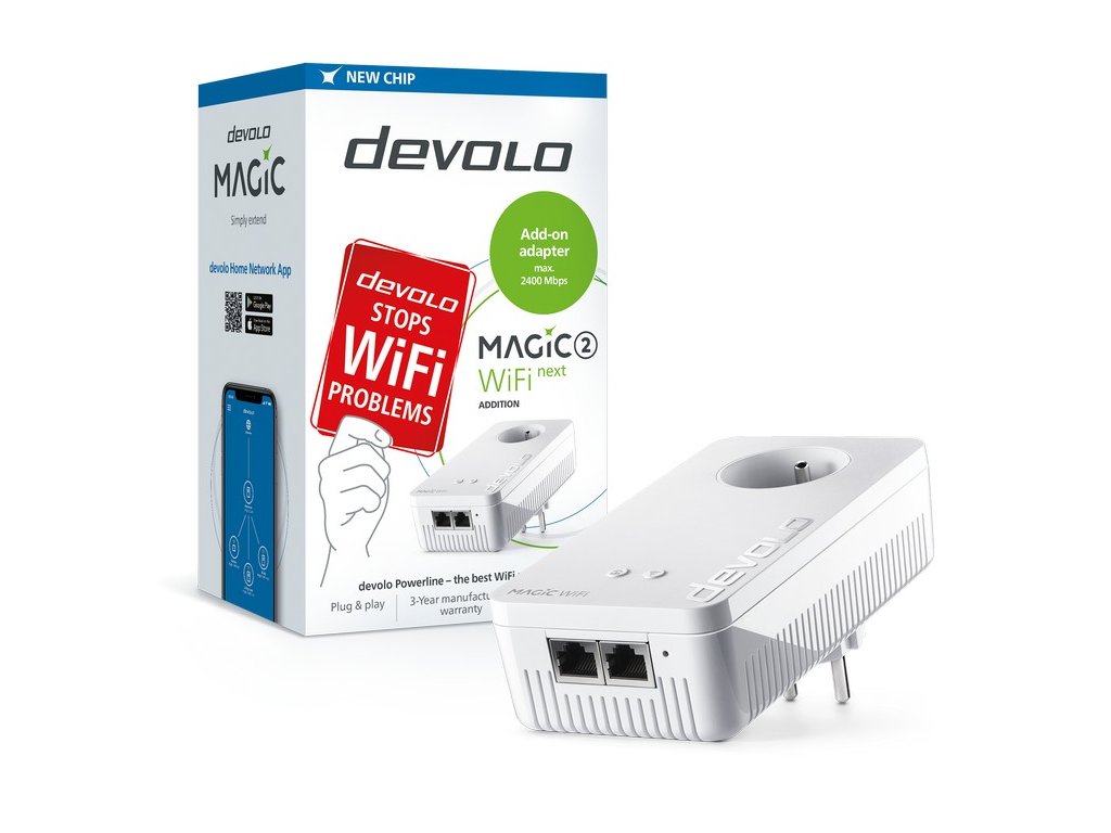 Devolo Magic – spolehlivá domácí síť vedená standardním elektrickým rozvodem Nejpopulárnější formou síťového rozvodu v domácnostech i některých společnostech je bezdrátová síť Wi-Fi. Na mnoha místech jsou však frekvence využívané pro bezdrátový rozvod zahlceny nebo rušeny. Následkem toho dochází ke zpomalení nebo dokonce výpadkům plynulého toku dat, což má za následek zastavování streamovaného videa nebo prodlevy při hraní her. Systémy Devolo nabízí stabilní řešení datového rozvodu v domě, bytě či kanceláři bez nutnosti složité kabelové instalace. K propojení jednotlivých přístrojů a rozvedení internetového připojení využívají standardní elektrický rozvod. Stačí zapojit jednotlivé komponenty do zásuvky a k dispozici je rychlé internetové i datové propojení všech přístrojů. Devolo nabízí jednoduchou alternativu všem složitým kabelovým instalacím, zachovává maximální rychlost až 2400 Mb/s a eliminuje zpomalení nebo výpadky bezdrátové Wi-Fi sítě vlivem rušení. Plynulost při streamingu videa z internetu, hraní online her, využívání aplikací pro virtuální realitu nebo kancelářské práci není tak již závislá na momentálním přetížení bezdrátové komunikace. Zapojte síťový adaptér do zásuvky a přenášejte data vysokou rychlostí Nejzajímavějším argumentem pro Devolo je jednoduchost instalace. Adaptéry stačí zapojit do zásuvky v místě, kde je aktuálně umístěné zařízení, které chce uživatel připojit do sítě a inteligentní technologie Plug and Play propojí všechny takto zapojené body do jediného celku. Navíc, přes kabelový elektrický rozvod dokáže takto navázané spojení přenášet data rychlostí až 2400 Mb/s, a to až na vzdálenost 500 metrů. Základem celého systému je startovací sada, která obsahuje dva adaptéry Devolo. Jeden z nich má integrovány dva konektory, z nichž jeden je určen pro připojení kabelu s internetovým připojením domácnosti nebo firmy. Druhý stačí zapojit do libovolné zásuvky v domě nebo bytě v místě, kde je umístěn počítač, chytrý televizor, herní konzole, datové úložiště NAS nebo jakýkoli jiný přístroj se sítovým rozhraním. Systém je pak možné rozšířit o libovolný počet adaptérů pro připojení dalších zařízení. Pokud přesune uživatel počítač nebo jiný připojený hardware na jiné místo v domě, stačí zapojit daný adaptér do nejbližší zásuvky. Aby systém Devolo neovlivnil negativně počet elektrických zásuvek v domě, je každý adaptér průchozí a má vestavěnu vlastní elektrickou zásuvku. Síťové standardy: IEEE 802.3, IEEE 802.3u, IEEE 802.3ab, IEEE 802.3x, IEEE 802.3az, IEEE 802.11 a, b, g, n, ac, k, r, v (2.4/5 GHz souběžně), IEEE 802.3az, IEEE 802.1p, Auto MDI/X, Wi-Fi Alliance, HomeGrid Forum Přenosová rychlost: PL až 2400 Mbit/s, Wi-Fi 867(mbps,2x2 MIMO/5 GHz) Wi-Fi 300(mbps,2x2 MIMO/2,4GHz) Dosah: až 500m, Wi-Fi 300m, Mesh Wi-Fi Modulace: Powerline OFDM - 4096/1024/256/64-QAM, QPSK, BPSK, Wi-Fi DSSS (IEEE 802.11b), Wi-Fi OFDM (IEEE 802.11a, g, n, ac), WiFi 32 Zabezpečení: WPA/WPA2,WPS PIN, WPS PBC, Wi-Fi Time Schedule, 128 Bit AES Rozhraní: 2 x Ethernet RJ45, 2x2 for 2,4 + 5 GHz souběh/ 4 x Antena Os: Windows 7 (32/64Bit),Windows 8 (32/64Bit), Windows 10 (32/64 Bit), Ubuntu-Linux 16.04 (32/64 Bit), MAC OS X 10.9Dodatočné parametre