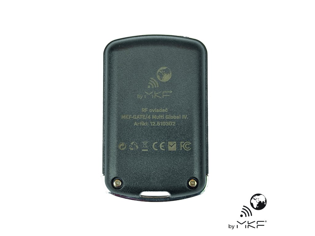 MKF-GATE/4 MULTI GLOBAL IV je nový univerzálny programovateľný diaľkový RF ovládač - duplikátor 4 GENERÁCIA. Je vhodný na ovládanie nielen pohonov garážových brán a brán. Pracuje na frekvencii 280 až 870 MHz. Je aktuálne kompatibilný so 141 značkami pohonov, resp. 702 typy diaľkových ovládačov . Puzdro ovládača je prachu vzdorné a má posuvný kryt tlačidiel.AMC: Automatické porovnanie kódu – párovanie