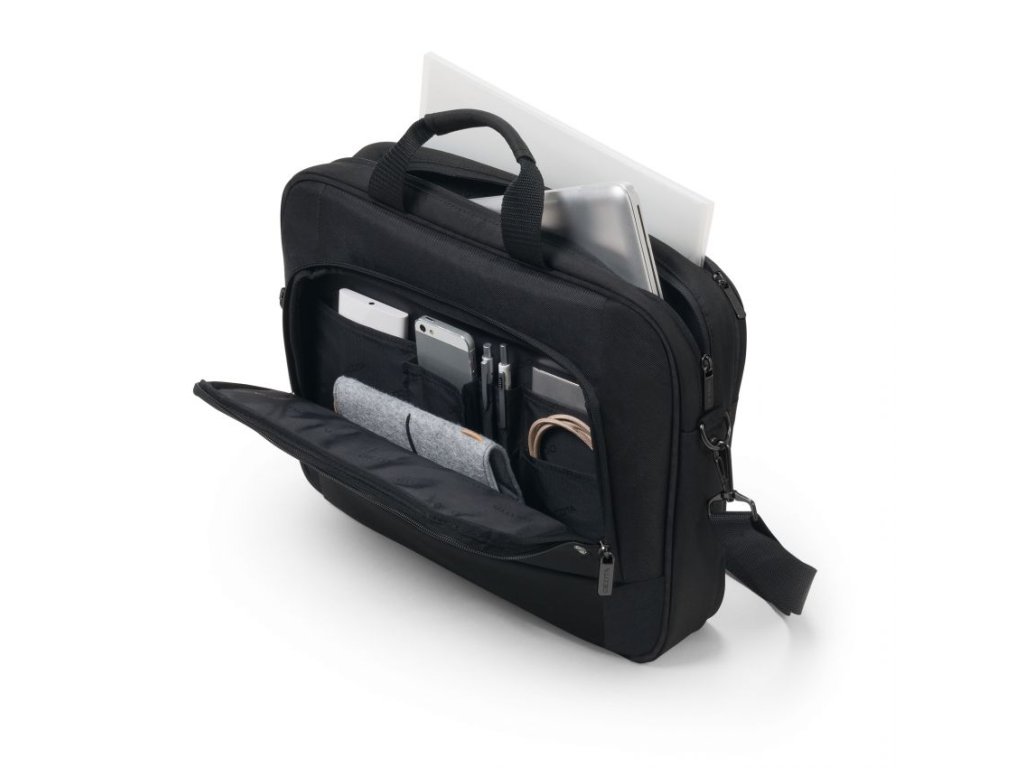 Lehké pouzdro na notebook s ochranným polstrováním a inteligentním úložným prostorem. Kompaktní pouzdro Eco Traveler BASE nabízí ideální ochranu notebooků mezi 13 a 14,1'' díky polstrování z pěny s vysokou hustotou (HDF). Pouzdro zaručuje mimořádnou stabilitu a ochranu díky kovovému rámu a flexibilní pohyblivosti díky svému lehkému designu. Je zde další přihrádka, do které můžete snadno ukládat dokumenty. Váš smartphone nebo jiné menší předměty, jako jsou kabely, pera nebo nabíječky, lze uložit do praktické přední kapsy, takže jsou vždy po ruce. Pouzdro se pohodlně nosí díky jeho neoprenovému polstrovanému držadlu a díky integrovanému popruhu jej lze během několika sekund připevnit ke kufru. Pouzdro můžete nosit také pomocí nastavitelného ramenního popruhu. Eco Traveler BASE je proto pro vás ideální, pokud jste stále na cestách a chcete podpořit recyklaci PET lahví ekologickým pouzdrem. Technické parametry *Vyrobeno z 8 recyklovaných PET lahví *Polstrovaná přihrádka na notebook s pěnou s vysokou hustotou (HDF) *Vysoce kvalitní kovové prvky *Úložný prostor pro dokumenty *Neoprenová polstrovaná rukojeť *Přední kapsa s úložným prostorem pro mobilní příslušenství *Popruh pro upevnění na kufru *Odnímatelný, nastavitelný ramenní popruh Technické parametry *Barva: Černá *Materiál: 300D rPET polyester *Max. rozměry zařízení: 350 x 40 x 245 mm *Rozměry produktu: 380 x 80 x 280 mm *Hmotnost: 0,75 kgDodatočné parametre