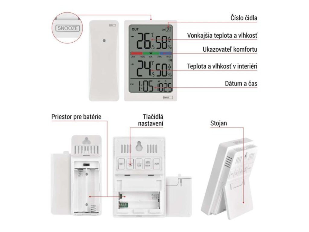 12/24 formát času: áno|budík: áno|časové pásma: nie|ďalšie funkcie: –|dátum: áno|dosah vo voľnom priestore: až 100 m|drôtová sonda k čidlu: nie|farebný displej (black mask) podsvietený: nie|funkcie stopky: nie|hlasová komunikácia: nie|hodiny: áno, quartz|inštalačný materiál: –|jazyky aplikácie: –|kalendár: nie|kompatibilita: –|LED podsvietenie displeja: nie|magnet na pripevnenie: nie|min. a max. teplota: áno|možné ďalšie čidlo: 3 (E00387)|možnosť nastavenia jednotky teploty °C/°F: °C/°F|možnosť zavesenia na stenu: áno|napájanie čidla: 2× 1,5 V AA (nie sú súčasťou balenia)|napájanie stanice: 2× 1,5 V AAA (nie sú súčasťou balenia)|notifikácie do mobilnej aplikácie: nie|odpočet času max. od: –|opakované budenie: áno|ovládanie hlasovými asistentmi: nie|pamäť poslednej hodnoty: nie|podporované OS: –|predajný obal: 1 ks, krabička|prenosová frekvencia: 433 MHz|prevedenie teplomera: bezdrôtový|protokol: –|rozmer čidla: 21 × 38 × 100 mm|rozmer hlavnej jednotky: 66 × 25 × 100 mm|sieťový adaptér: nie|teplotná výstraha: nie|teplotný index: nie|trend teploty: áno|trend tlaku: nie|trvalé podsvietenie: nie|veľkosť displeja: 53 × 82 mm|vnútorná teplota: -10 °C až +50 °C, rozlíšenie 0,1 °C|vnútorná vlhkosť: 1 % až 99 % RV, rozlíšenie 1 %|vonkajšia teplota: -40 °C až +60 °C, rozlíšenie 0,1 °C|vonkajšia vlhkosť: 1 % až 99 % RV, rozlíšenie 1 %Dodatočné parametre