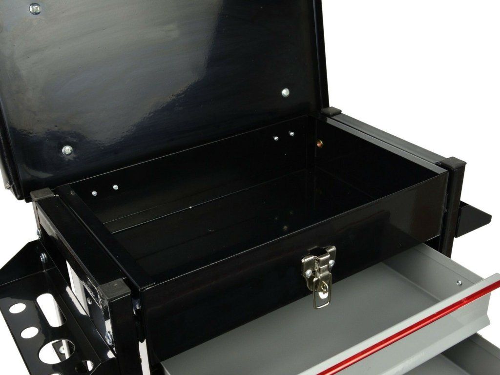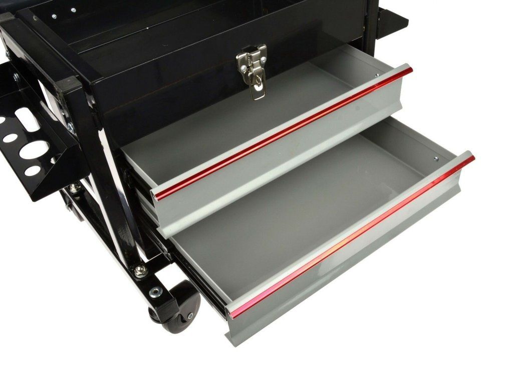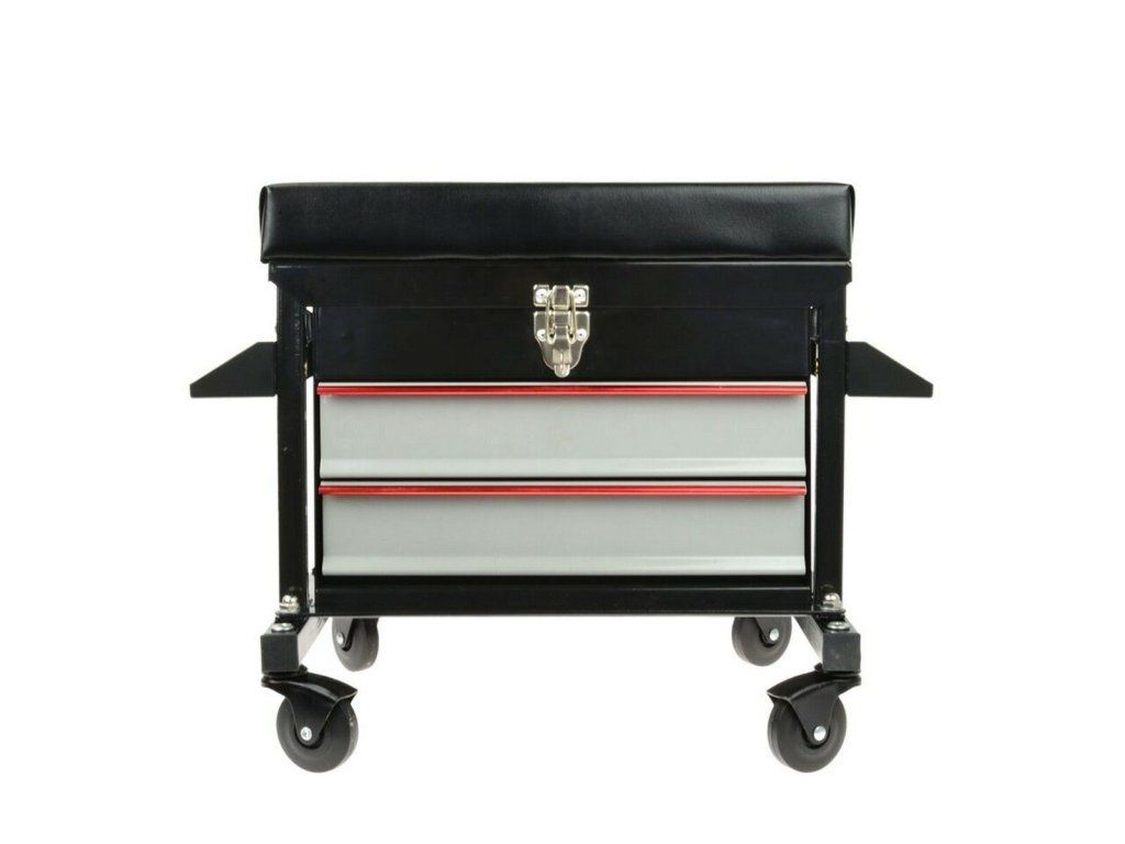 Montážní dílenská stolička s 2 zásuvkami a odkládacím prostorem je skvělým doplňkem každé dílny a autoservisu. Židle je vyrobena z pevné ocelové konstrukce a je vybavena měkkým komfortním sedátkem potaženým koženkou. Pod sedadlem montážní židle se nachází uzavíratelný odkládací prostor a dvě zásuvky, na bocích jsou dva úchyty s otvory na odkládání nářadí jako jsou šroubováky nebo ráčny.