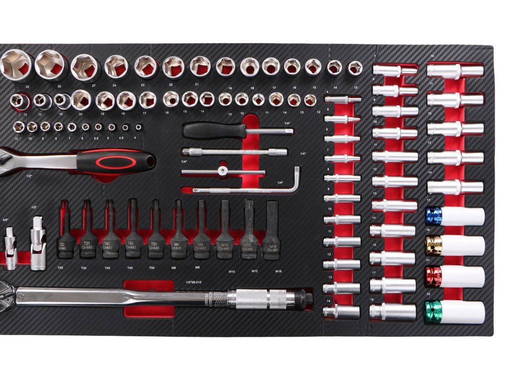 - 1. Šuplík – 136x Nástrčné hlavice, bity, ráčny, prodloužení a momentový klíč - 4x Barevné nástrčné hlavice 1/2": 17; 19; 21; 22 mm