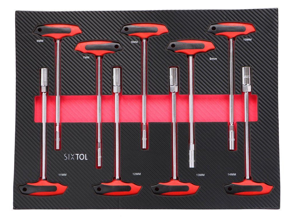 - 4. Šuplík – 9x T-ráčnové nástrčné klíče (T-bar socket set) - Velikosti: 6; 7; 8; 9; 10; 11; 12; 13; 14 mm