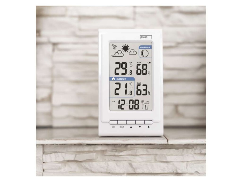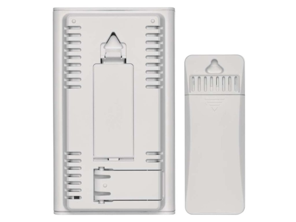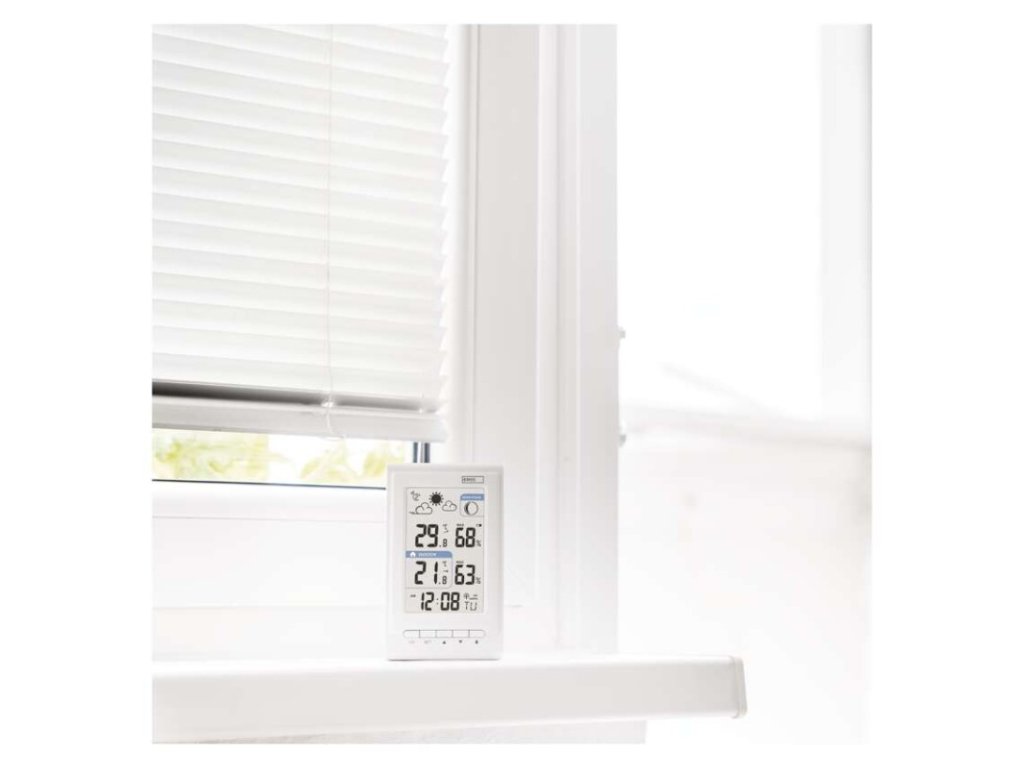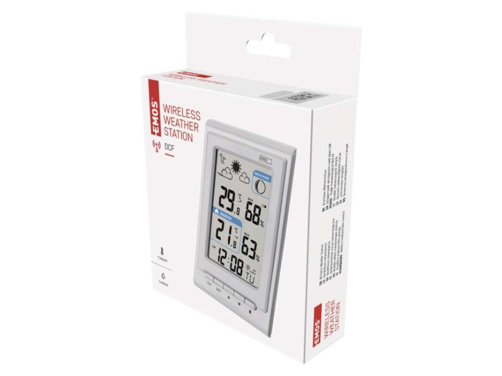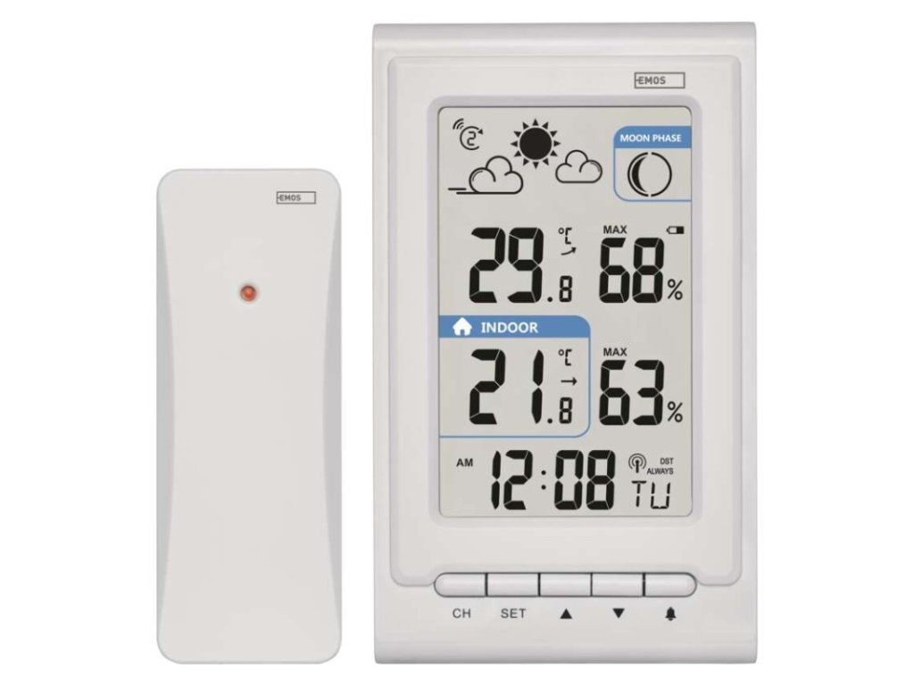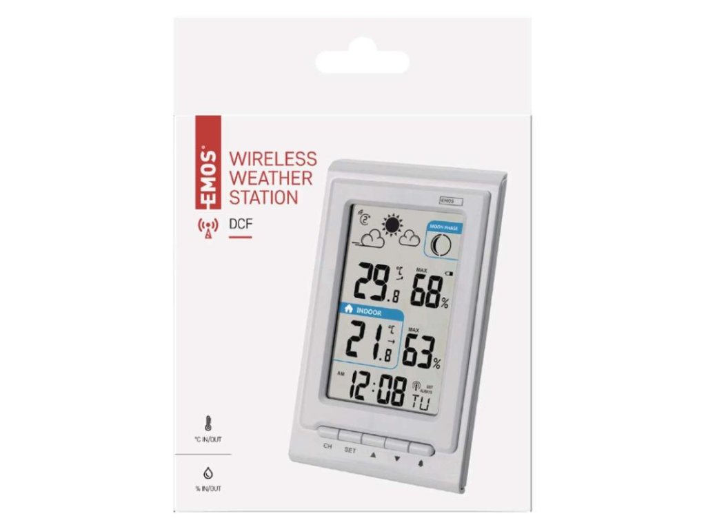 12/24 formát času: áno|anemometer: nie|barometer: nie|budík: áno|časové pásma: áno|ďalšie funkcie: –|dátum: áno|dosah snímača: až 30 m|drôtová sonda k čidlu: nie|elektronické plošné podsvietenie: nie|farebný displej (black mask) podsvietený: nie|fázy mesiaca: áno|hodiny: riadené DCF signálom|kalendár: áno|kompatibilita: –|korekcia nadmorskej výšky: nie|LED podsvietenie displeja: nie|min. a max. teplota: áno|možné ďalšie čidlo: až 3 čidla (E05018, E00387)|možnosť nastavenia jednotky teploty °C/°F: °C/°F|možnosť zavesenia na stenu: áno|napájanie čidla: 2× 1,5 V AA (nie sú súčasťou balenia)|napájanie stanice: 2× 1,5 V AAA (nie sú súčasťou balenia)|notifikácie do mobilnej aplikácie: –|opakované budenie: áno|ovládanie hlasovými asistentmi: –|podporované OS: –|predajný obal: 1 ks, krabička|predpoveď počasia: áno|prenosová frekvencia: 433 MHz|prevedenie teplomera: bezdrôtové|produkt: metestanica|projekcia: nie|protokol: –|rozmer čidla: 21 × 38 × 100 mm|rozmer hlavnej jednotky: 23 × 76 × 126 mm|sieťový adaptér: nie|teplotná výstraha: nie|trend teploty: áno|trend tlaku: nie|trvalé podsvietenie: nie|veľkosť displeja: 50 × 81 mm|vnútorná teplota: -10 °C až +50 °C, rozlíšenie 0,1 °C|vnútorná vlhkosť: 1 % až 99 % RV, rozlíšenie 1 %|vonkajšia teplota: -40 °C až +60 °C, rozlíšenie 0,1 °C|vonkajšia vlhkosť: 20 % až 95 % RV, rozlíšenie 1 %|zrážkomer: nieDodatočné parametre