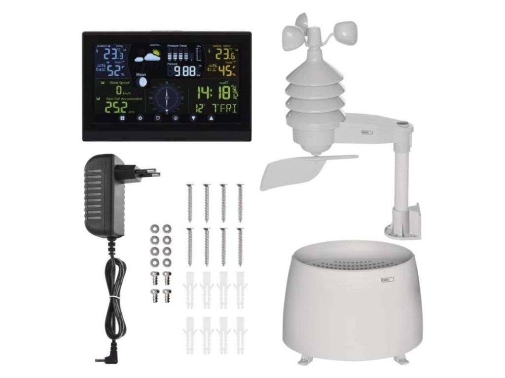 12/24 formát času: áno|anemometer: áno|barometer: áno|budík: áno, 2×|časové pásma: áno|dátum: áno|dosah snímača: až 100 m|drôtová sonda k čidlu: nie|elektronické plošné podsvietenie: áno|farebný displej (black mask) podsvietený: nie|fázy mesiaca: áno|hodiny: riadené DCF signálom|kalendár: áno|korekcia nadmorskej výšky: áno|LED podsvietenie displeja: áno|min. a max. teplota: áno|možné ďalšie čidlo: až 3 snímače teploty a vlhkosti (E06018), 1 snímač anemometer (E06016)|možnosť nastavenia jednotky teploty °C/°F: °C/°F|možnosť zavesenia na stenu: áno|napájanie čidla: 4× 1,5 V AA (nie sú súčasťou balenia)|napájanie stanice: 3× 1,5 V AAA (nie sú súčasťou balenia)|opakované budenie: áno|predajný obal: 1 ks, krabička|predpoveď počasia: áno|prenosová frekvencia: 433 MHz|prevedenie teplomera: bezdrôtové|produkt: metestanica|projekcia: nie|rozmer čidla: 250 × 160 × 100 mm|rozmer hlavnej jednotky: 17 × 192 × 127 mm|sieťový adaptér: áno, 5 V DC/300 mA (súčasťou balenia)|teplotná výstraha: áno|trend teploty: áno|trend tlaku: áno|trvalé podsvietenie: áno|veľkosť displeja: 168 × 93 mm|vnútorná teplota: -10 °C až +50 °C, rozlíšenie 0,1 °C|vnútorná vlhkosť: 1 % až 99 % RV, rozlíšenie 1 %|vonkajšia teplota: -30 °C až +60 °C, rozlíšenie 0,1 °C|vonkajšia vlhkosť: 1 % až 99 % RV, rozlíšenie 1 %|zrážkomer: ánoDodatočné parametre