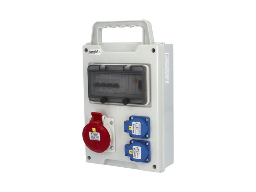 Přenosná zásuvková skříň FAMATEL eb165-6kA-EB201000.1 /8M IP44 jištěná s chráničem 40/4/003, zásuvky 2x230V, 1x16/5, přístroje EATON 6kA: 1xPL6-B16/1, 1xPL6-B16/3, PF6-40/4/003 na vstupu, použité pouzdro: 6201-20 (8mod.) - 355x215x85mm, barva: světle šedá. Přenosná zásuvková skříň (rozváděč nízkého napětí) FAMATEL eb165-6kA-EB201000.1 /8M IP44 jištěná s chráničem 40/4/003, zásuvky 2x230V/16A (s ochranným kolíkem dle ČSN), 1x400V/16A/5pól, jistící přístroje EATON 6kA: 1xPL6-B16/1, 1xPL6-B16/3, PF6-40/4/003 na vstupu (citlivost na reziduální proud 30mA), použité pouzdro: 6201-20 - celkem k dispozici 8mod. míst, rozměry: 355x215x85mm, plastová, materiál ABS, IK08, zkouška žhavou smyčkou 650°C, bezhalogenová a UV odolná, montáž na povrch, barva: světle šedá, rozsah teplot -25°C +85°C, aplikované normy: IEC 61439-3 (Rozváděče nízkého napětí - Část 3: Rozvodnice určené k provozování laiky (DBO), balení: 1ks (fólie), zásuvky na 230V/16A s ochranným kolíkem dle ČSN, polykarbonátové okénko, jistící prvky EATON, PE svorkovice součástí (6x16mm2), N svorkovice součástí (6x16mm2), hladké stěny (bez prolisů) pro vyvrtání vstupního otvoru a následné osazení příslušnou vývodkou, max. připojitelný vstupní kabel = 5x16 (Cu), dodáno s průvodní dokumentací: štítkem rozváděče, návodem pro obsluhu a montáž, krycím listem (charakteristiky rozhraní), protokolem o kusové zkoušce, ES prohlášením o shodě, schématem zapojení a zkouškou oteplení pro rozváděče nízkého napětí. Pro montáž na hořlavé podklady je nutné použít nehořlavou podložku.Recyklační poplatek je zahrnut v ceně výrobku.