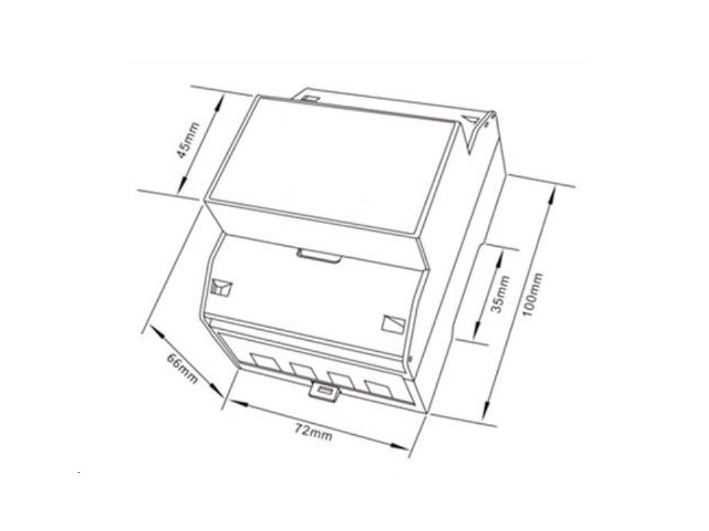 Rozměry: 72 × 100 × 66 mm (Š x V x H) – Velikost 4 DIN moduly.