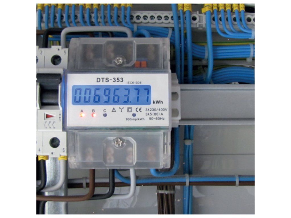 Podružný 3-fázový 1-tarifní digitální elektroměr pro přímé informativní měření DTS 353-L 80A, 4,5mod. Třífázový elektroměr s LCD displejem pro střídavé napětí 3x230 V / 400 V, 50Hz, slouží k měření činné elektrické energie v přímém zapojení do obvodu. Je určen na podružné měření spotřeby samostatných spotřebičů nebo spotřebičů ve skupinách. J