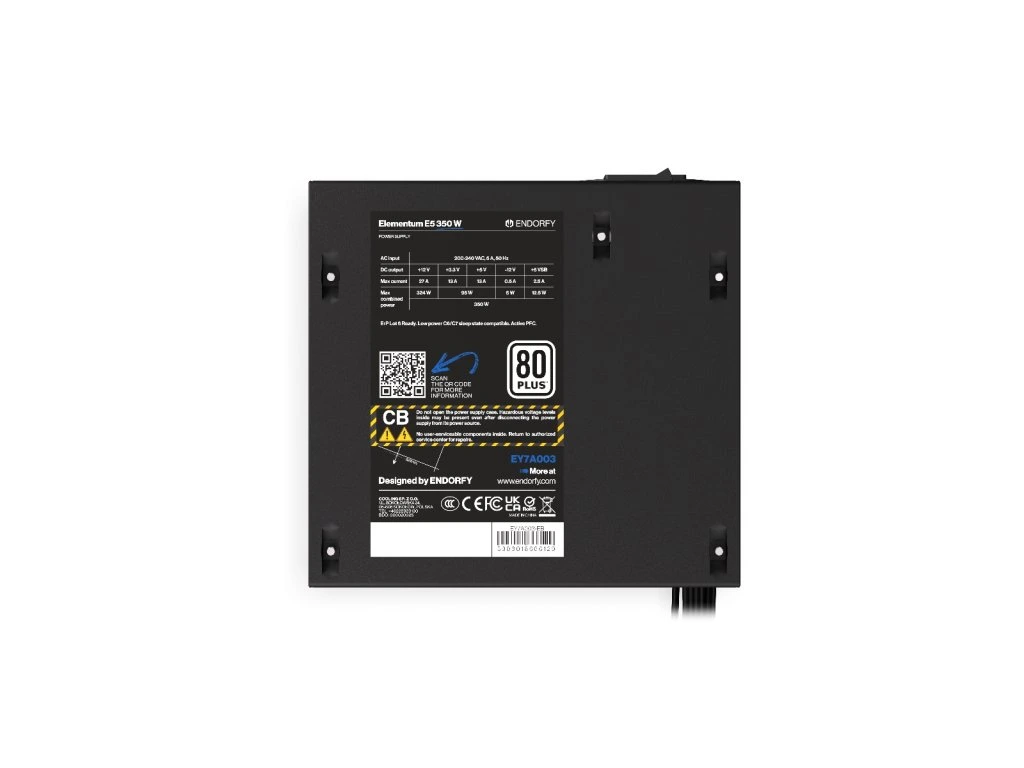 ENDORFY Elementum E5 350W Napájecí zdroj ATX Barva: černá Rozměry (V × Š × D): 87 × 140 × 150 mm Trvalý výkon: 350 W Účinnost: 80 PLUS® Kabeláž: s černým pláštěm Ventilátor: 120 mm Ochrany: OVP UVP SCP OPP SIP Vstupní napětí: 230 V Počet konektorů a délka kabelu: 1× EPS 12V 8-PIN (4+4), 625 mm 1× ATX 24-PIN, 450 mm 1× PCI-E 8-PIN (6+2), 460 mm 4× SATA, 410 - 700 mm 2× MOLEX, 410 - 555 mm Záruka: 36 měsícůDodatočné parametre