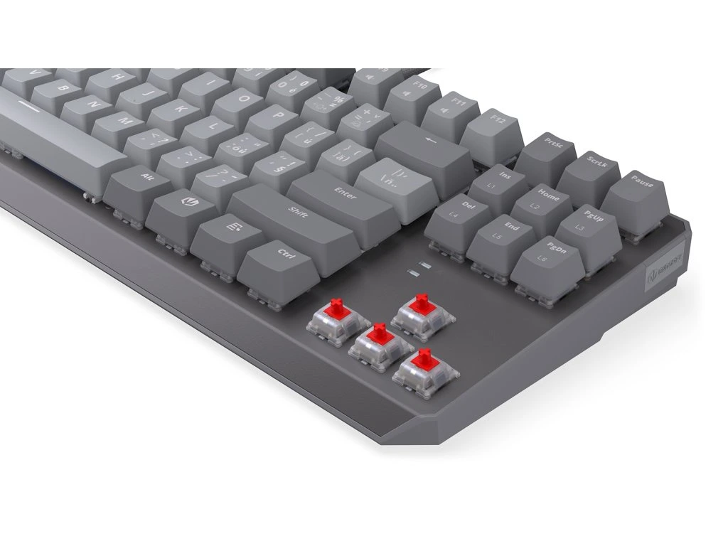 ENDORFY Thock V2 TKL CZ *Z výroby promazané spínače ENDORFY Red *Vysoce kvalitní šasi vyztužené pevnou hliníkovou horní deskou *Tři vrstvy pěny (PORON, EPDM, IXPE) pro potlačení vibrací a zlepšení akustiky *Stabilní a citlivá konstrukce — ideální pro rychlé a přesné psaní *Pokročilý software pro personalizaci nastavení klávesnice Specifikace Typ klávesnice: Mechanická Barva: Šedá Rozložení: CZ (české) Rozměry: 361.5 × 140 × 42.5 mm Počet kláves: 87 Typ spínačů: ENDORFY Red (lineární, tiché, rychlá odezva) Barva spínačů: Červená Hot-swap: Ano – možnost výměny spínačů bez pájení Materiál kláves: ABS Podsvícení: ARGB – plně přizpůsobitelné barevné efekty Konektivita: USB, cable length: 1.8 m Kompatibilita: Windows MacOS Linux AndroidDodatočné parametre
