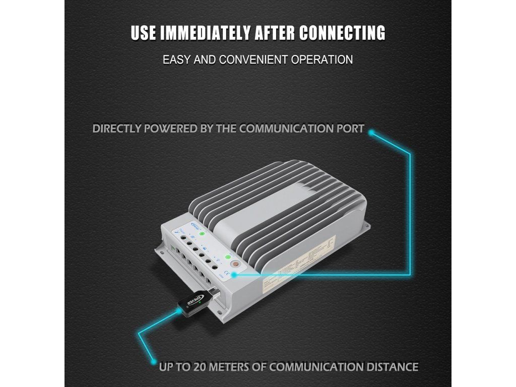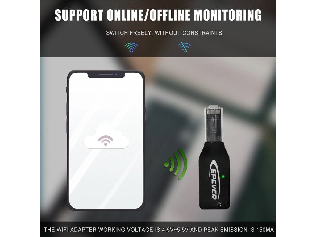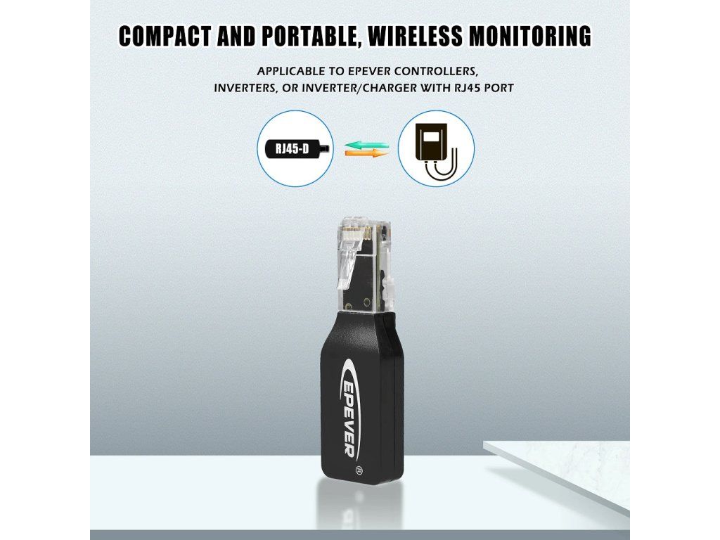 EPEVER WiFi 2.4G RJ45 D WiFi adaptér se používá především pro přenos dat o výrobě energie z produktů EPEVER na cloudový server EPEVER. Podporuje také lokální bezdrátové monitorování a nastavování parametrů.