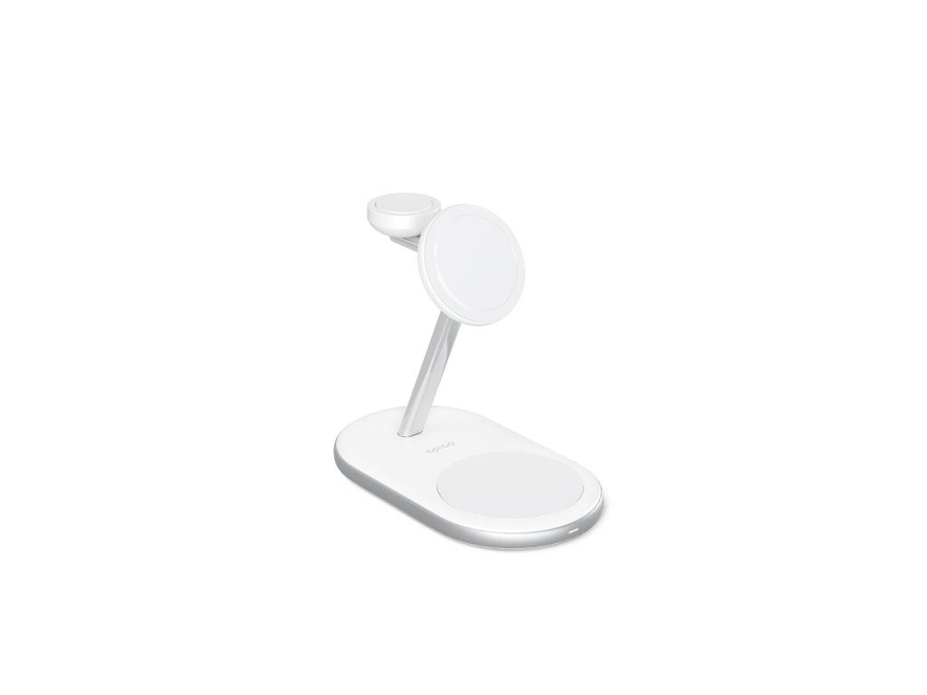 Nabíjecí stojánek, bezdrátový, certifikace Made for MagSafe, Made for Watch, bezdrátové nabíjení iPhone 15W, nabíjecí plocha pro AirPods 5W, rychlonabíjecí modul pro Apple Watch 3W, kabel součástí, 30W PD adaptér součástí, barva bílá Epico 3in1 MagSafe Charging Stand nabízí maximální pohodlí pro nabíjení vašich zařízení Apple. Stojánek je vyrobený z odolných prémiových materiálů se stylovým minimalistickým designem. Díky certifikaci Made for MagSafe a Made for Watch zajišťuje nejrychlejší možné bezdrátové nabíjení vašeho iPhonu a Apple Watch. Nabijte svůj iPhone s výkonem 15 W a Apple Watch 7, 8, 9 nebo Ultra až o 33 % rychleji s 3W rychlonabíjecím modulem. AirPods můžete nabíjet maximálním výkonem až 5 W. Vše, co potřebujete, je součástí balení: kabel USB-C na USB-C a výkonný 30W PD adaptér. Vstupní napětí/proud: DC 5 V/3 A, 9 V/3 A, 12 V/3 A, 12 V/2,5 A, Bezdrátový výstup 1 (iPhone): 15W.Bezdrátový výstup 2 (Apple Watch): 3W, Bezdrátový výstup 3 (AirPods): 5W, Celkový bezdrátový výstup: 23W, Materiál: hliníková slitina, PC, ABS, silikon, Rozměry: 98×124×70 mm, Hmotnost: 300 gDodatočné parametre