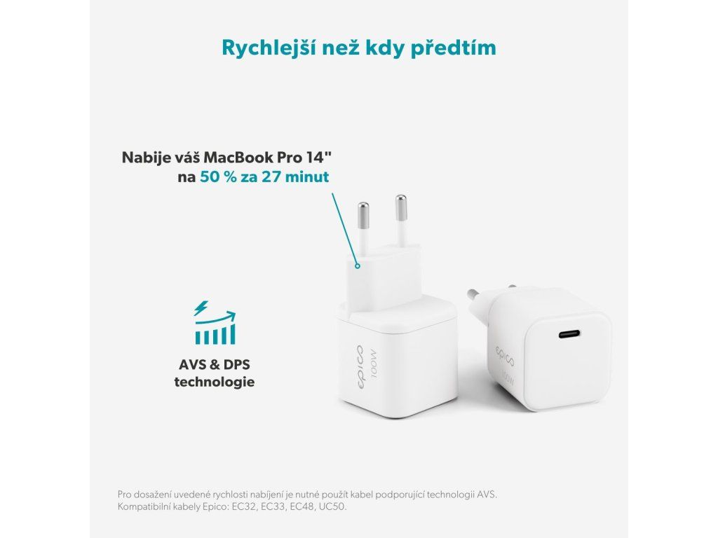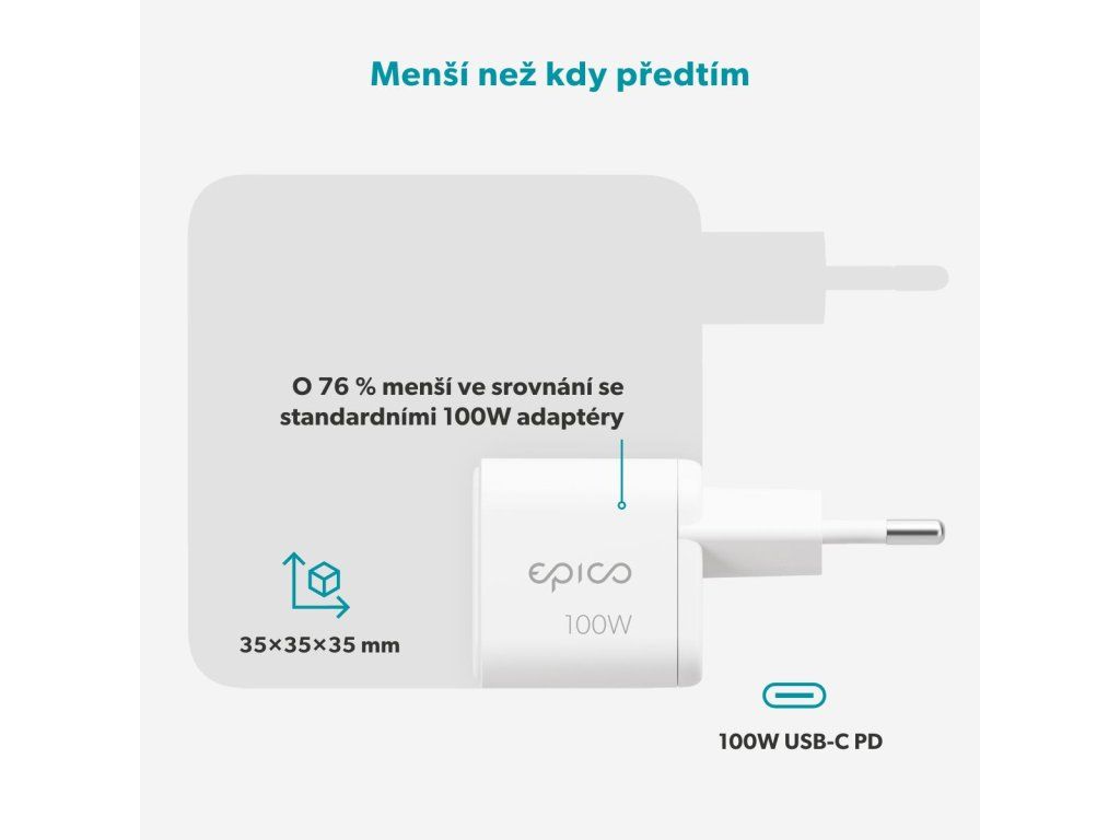 Maximální výkon v ultra kompaktním provedení Nabíječka Epico UltraBoost Micro AVS GaN 100W Dynamic Wall Charger EA100b přináší vysoký nabíjecí výkon až 100 W v překvapivě kompaktním provedení. Bez problémů zvládne rychlé dobíjení i náročnějších zařízení včetně notebooků, přičemž iPhone 17 Pro nabije na 50 % za pouhých 20 minut. Díky podpoře technologie Power Delivery je navíc přenos energie efektivní a optimalizovaný. Chytré a bezpečné nabíjení pro každý den Oproti běžným 100W adaptérům má nabíječka až o 76 % menší rozměry, což oceníte při každodenním přenášení i cestování. Moderní GaN technologie snižuje zahřívání a zvyšuje celkovou účinnost, zatímco dynamické nabíjení AVS & DPS se aktivně přizpůsobuje aktuálním potřebám připojeného zařízení. Výsledkem je rychlé, šetrné a bezpečné nabíjení, podpořené pokročilými ochrannými prvky proti zkratu, přepětí, přetížení i přehřátí.Dodatočné parametre