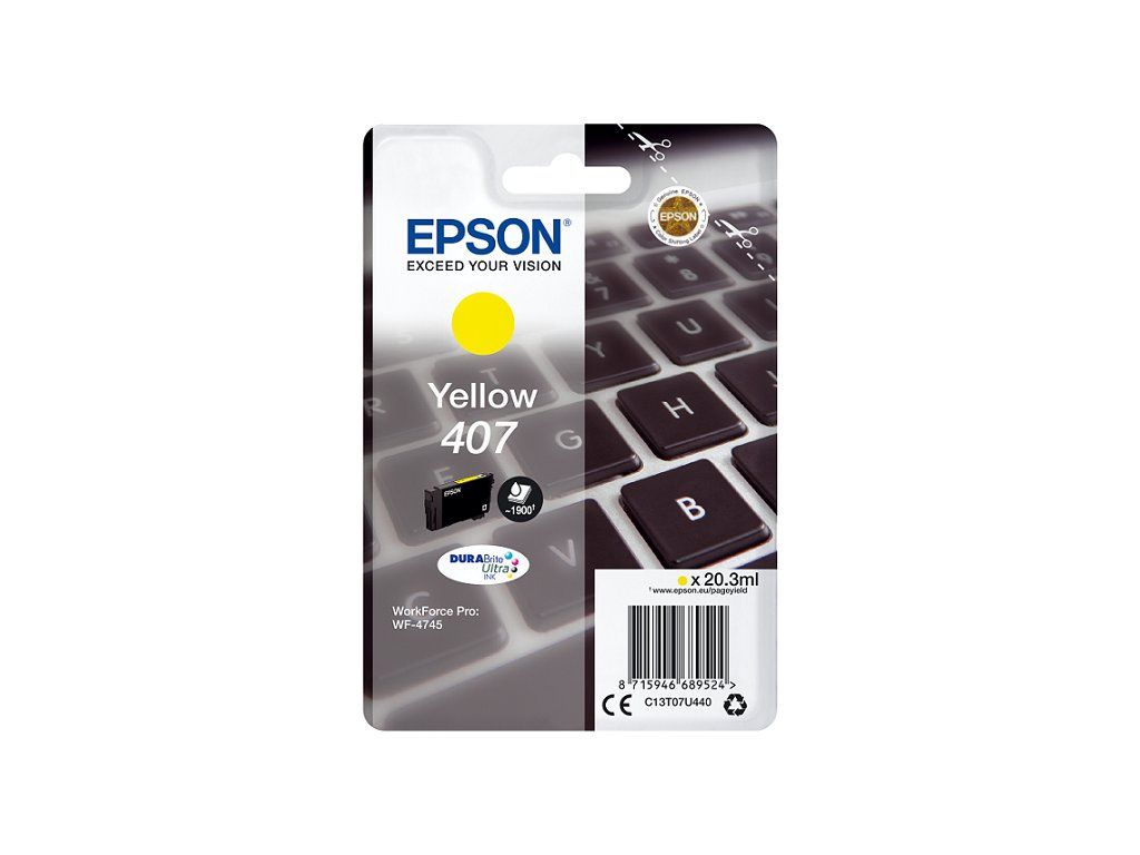 Originální cartridge Epson 407, C13T07U440 Barva: Žlutá (yellow) Výtěžnost: 20,3 ml Kompatibilní zařízení: WorkForce Pro WF-4745DTWFDodatočné parametre