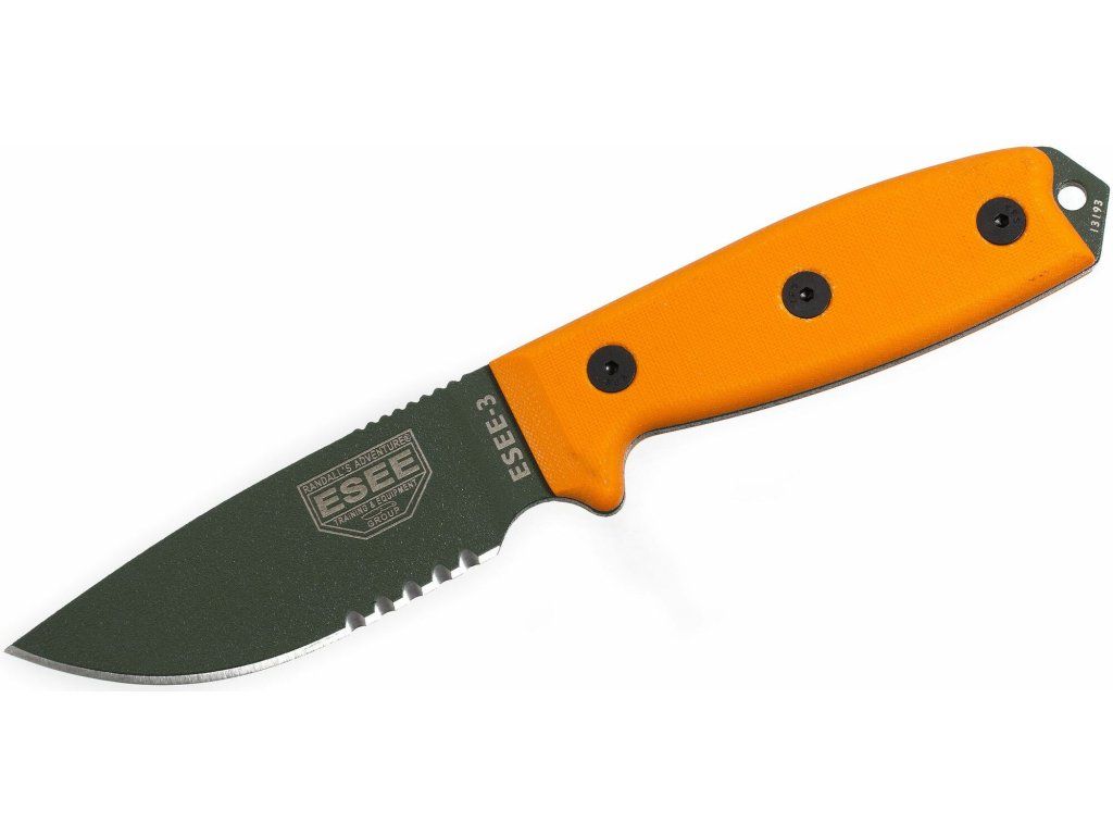 ESEE-3S-MB-OD Serrated univerzálny nôž 9,8cm, zelená oranžová, G10 pripínacie plastové puzdro čierna