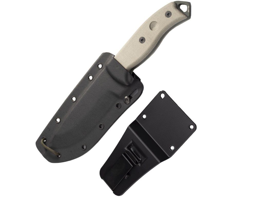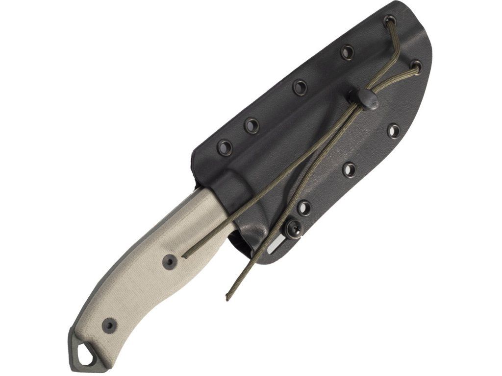 Rukoväť je z kompozitu Micarta krémovej farby. Je v nej malá jamka na použitie pri zakladaní ohňa. V spodnej časti je rozbíjač skla.