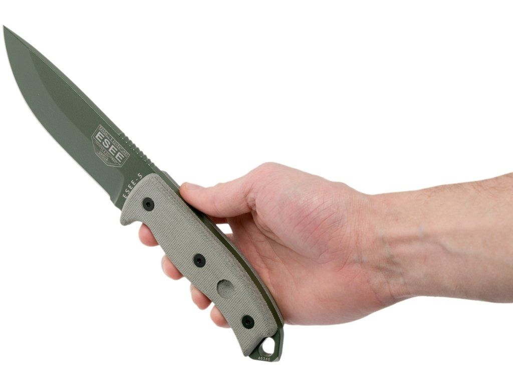 Veľký nôž na prežitie ESEE Model 5 navrhnutý vojenskými inštruktormi SERE, vhodný pre taktické účely.