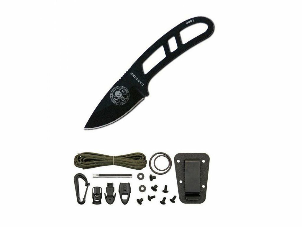 Malý pevný nôž na krk ESEE CAN-B-KIT-E Black Candiru je vhodný na prežitie, ale aj na každodenné (EDC) nosenie. So súpravou na prežitie.