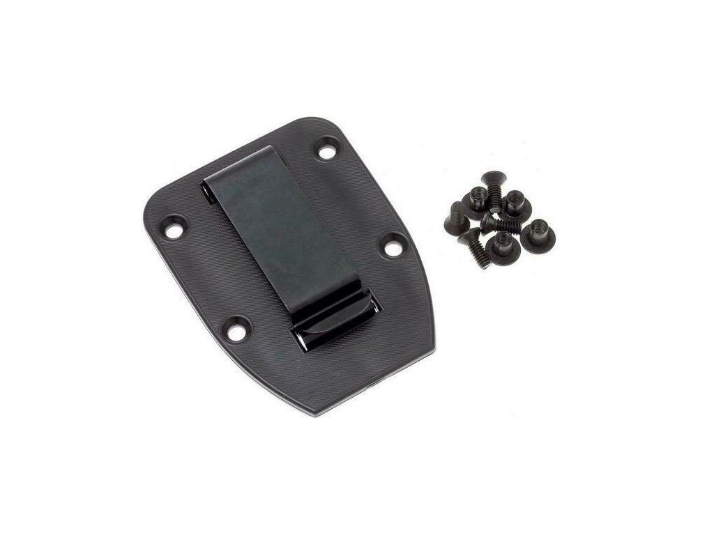 Lisovaná spona ESEE CLIP-PLATE 3/4 Clip Plate na puzdro modelov 3 a 4, vhodná na nosenie na ľavej alebo pravej strane. Obsahuje plastovú montážnu dosku, sponu z pružinovej ocele a všetok montážny materiál.
