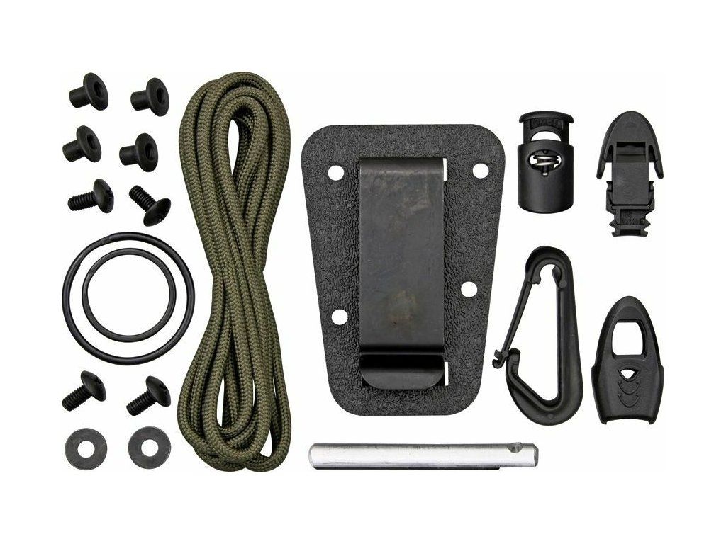 Súčasťou je aj súprava na prežitie: paracord, zámok na šnúre, veľký delený krúžok, malý delený krúžok, fero požiarnu tyč, núdzovú píšťalku a plastovú karabínku.