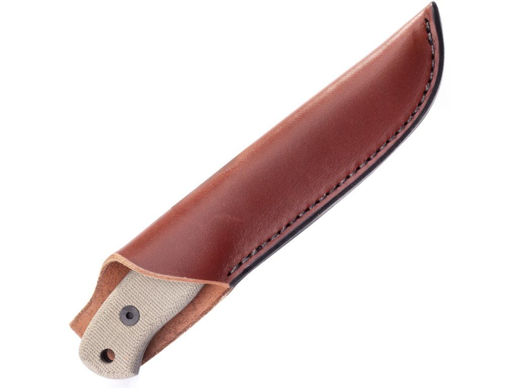 Ergonomicky tvarovaná rukoväť je vyrobená z odolného kompozitu Micarta hnedej Tan farby, s otvorom na šnúrku.