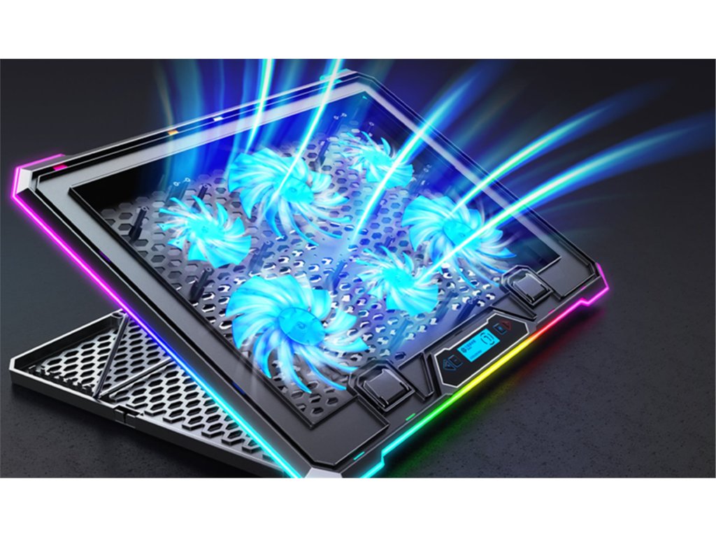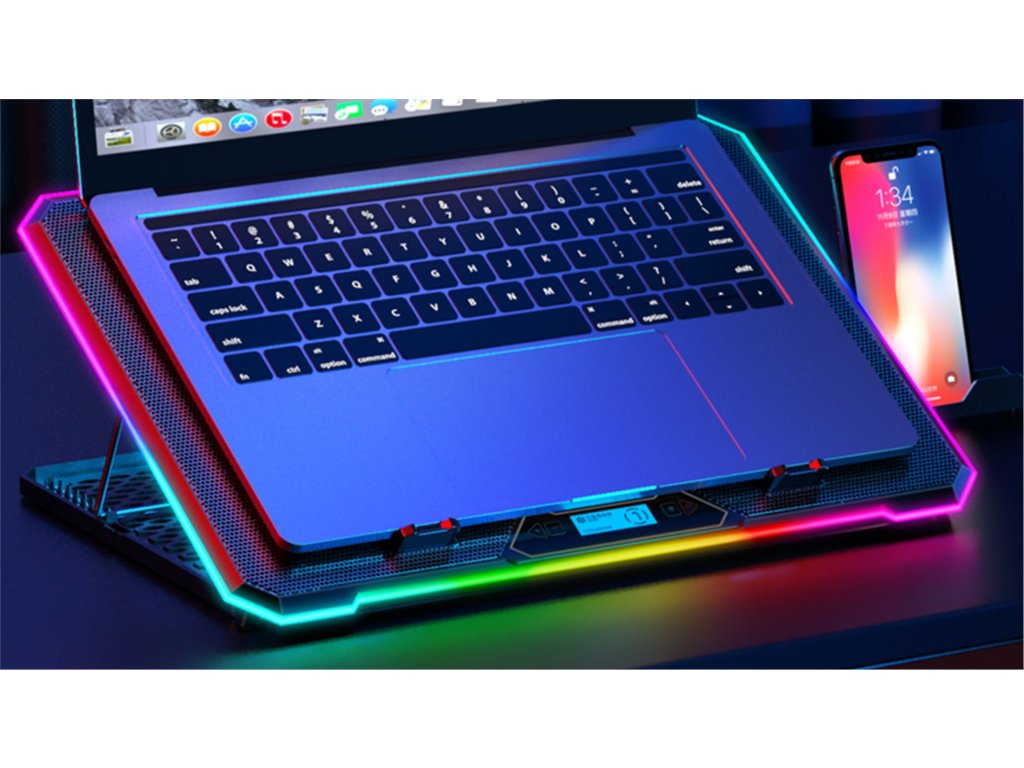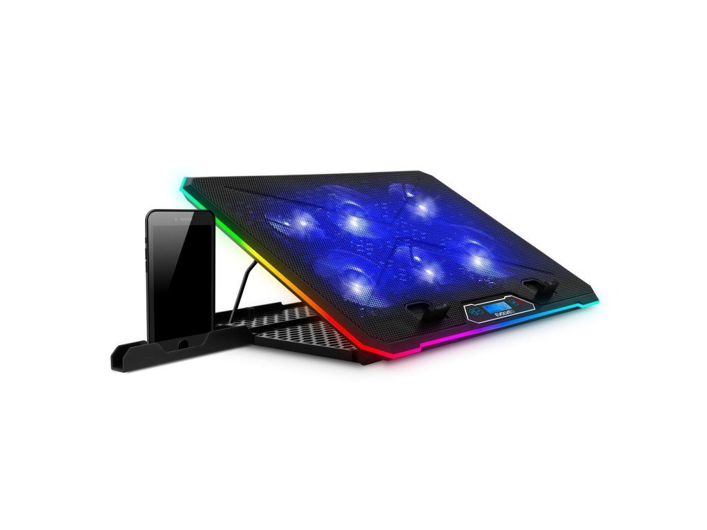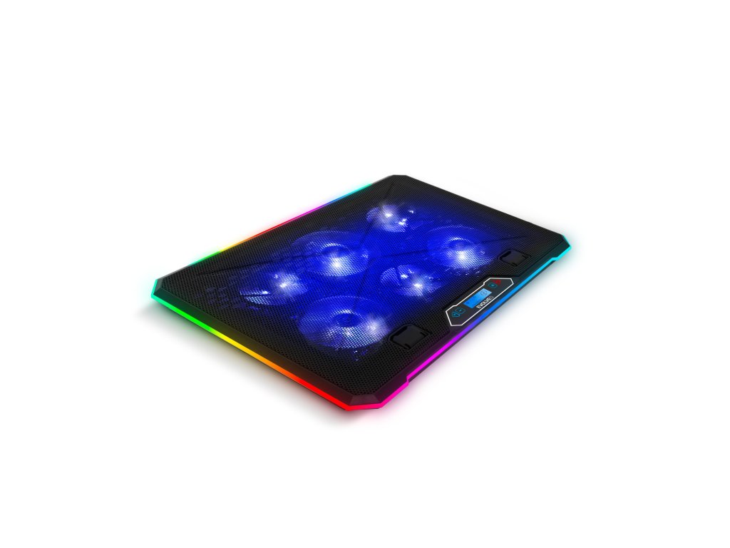 • Pro notebooky 10-17'' • Modré LED podsvícení • 3x 100 mm ventilátor • 3x 70 mm ventilátor • Regulace rychlosti otáček ventilátorů • 3 barevné + 4 RGB módy obvodového podsvícení • Podsvícený digitální displej • Výškově polohovatelná (9 úhlů) • 2x USB vstup • Odnímatelný stojánek na telefon