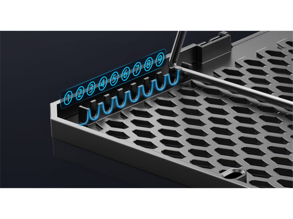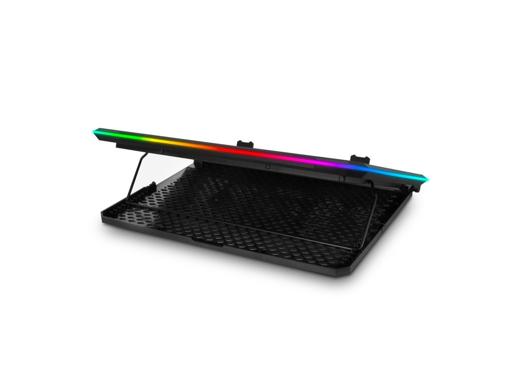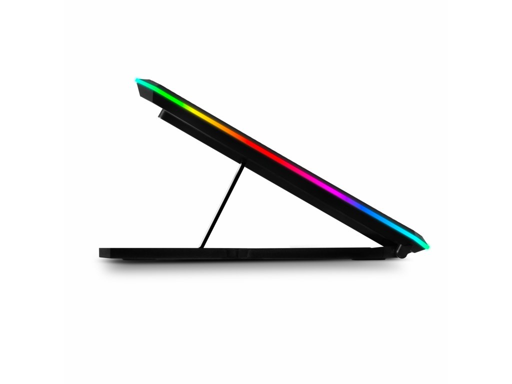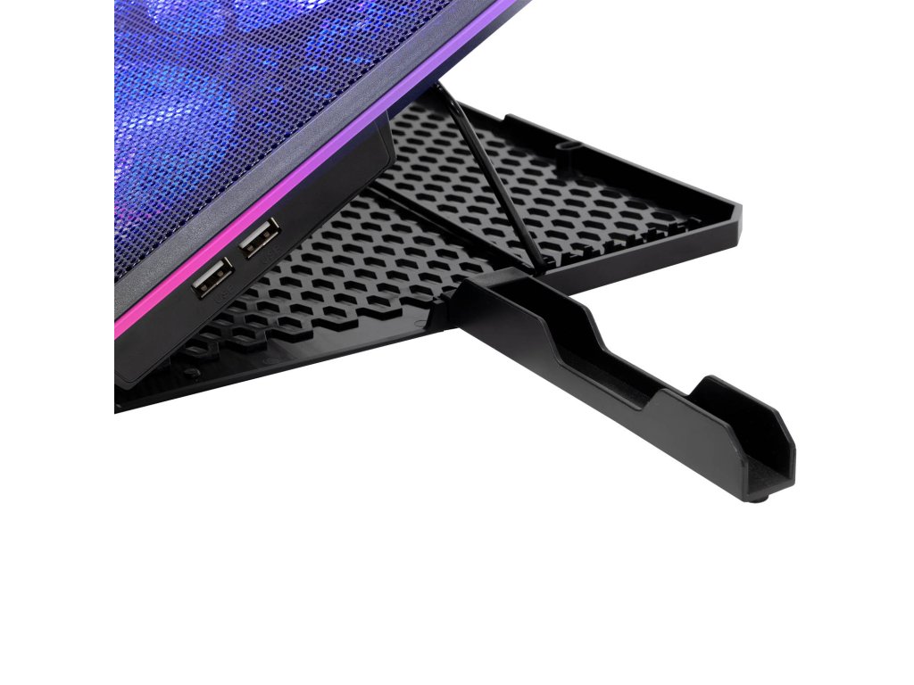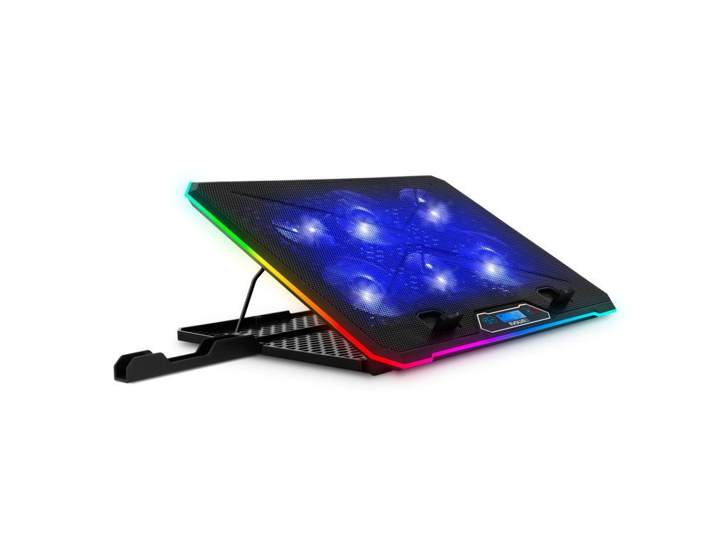 • Pro notebooky 10-17'' • Modré LED podsvícení • 3x 100 mm ventilátor • 3x 70 mm ventilátor • Regulace rychlosti otáček ventilátorů • 3 barevné + 4 RGB módy obvodového podsvícení • Podsvícený digitální displej • Výškově polohovatelná (9 úhlů) • 2x USB vstup • Odnímatelný stojánek na telefon