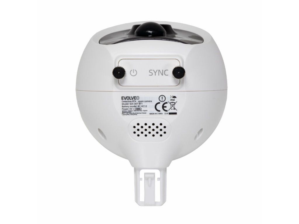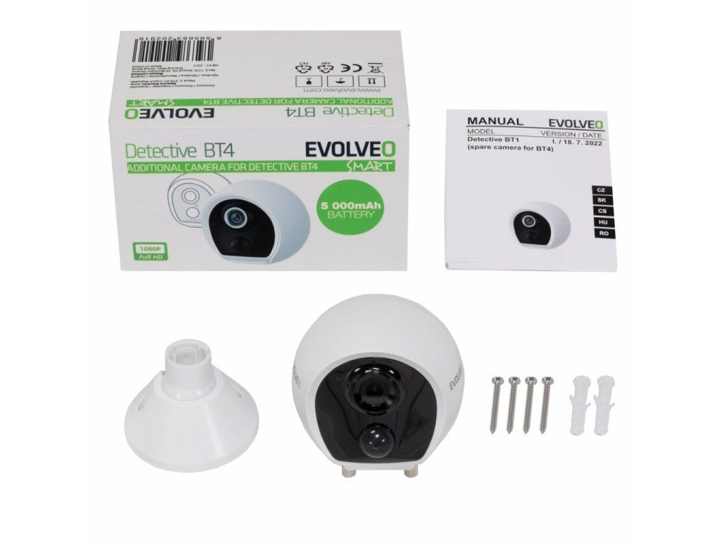 Náhradní kamera určená pro rozšíření instalace EVOLVEO Detective BT4. Kamera je vybavená akumulátorem s 5000mAh kapacitou. Pod krytkou se nachází USB-C konektor pro nabíjení a tlačítko pro zapnutí/vypnutí a párovací režim. Kamera je vybavená nočním IR přísvitem a PIR čidlem pro rozeznání pohybu. Součástí kamery je i mikrofon a reproduktor pro obousměrnou hlasovou komunikaci. Kamera se do svého držáku pouze jednoduše nasune, což usnadňuje její montáž. V případě potřeby nabití akumulátoru, lze kameru jednoduše z držáku sejmout zatlačením na jeho západku. Kamera je vyrobena ve shodě se standardem IP66, lze ji umístit i ve venkovních prostorách, je ale nutné se vždy ubezpečit, že je řádně zavřená spodní krytka.Kamera je samostatně nefunkční, je nutné ji použít spolu s kamerovým systémem EVOLVEO Detective BT4 SMART !