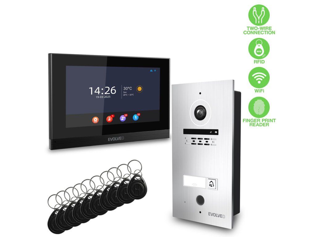 • 1× vnitřní jednotka (7” monitor) • 1× venkovní jednotka (kamera + RFID + otisk prstu) • 1× napájecí adaptér DC 24 V / 1 A • 1× montážní držák a montážní materiál • 1× set propojovacích kabelů pro 2-vodičový systém • 10× RFID čip 125 kHz • 1× uživatelský manuálDodatočné parametre