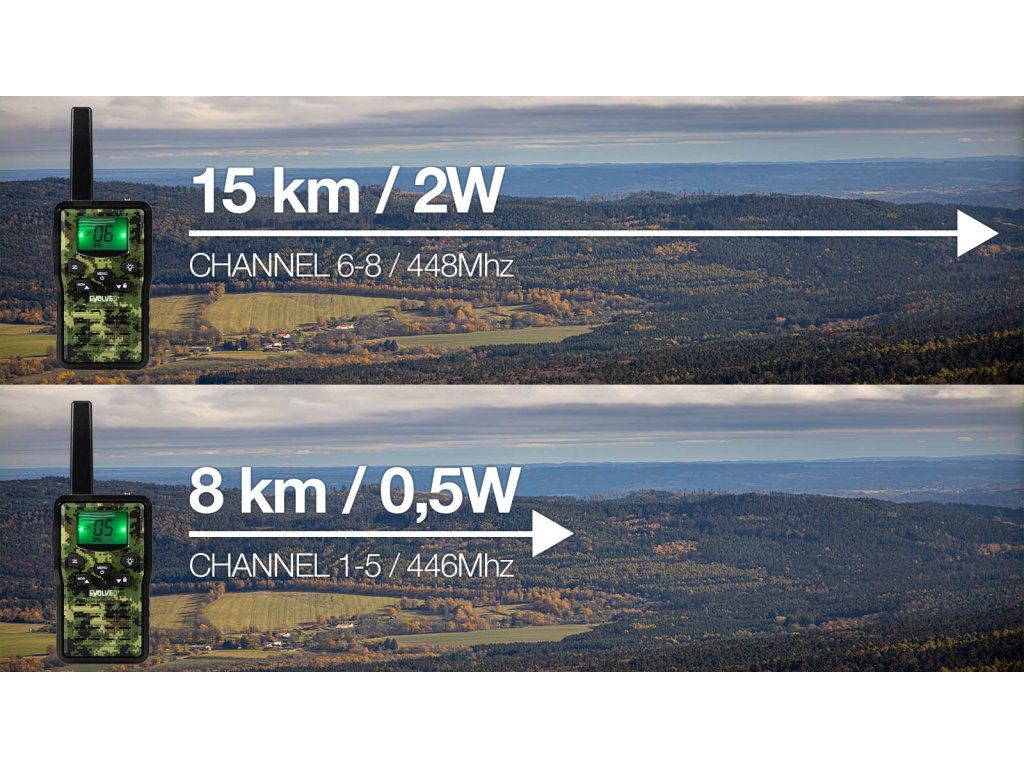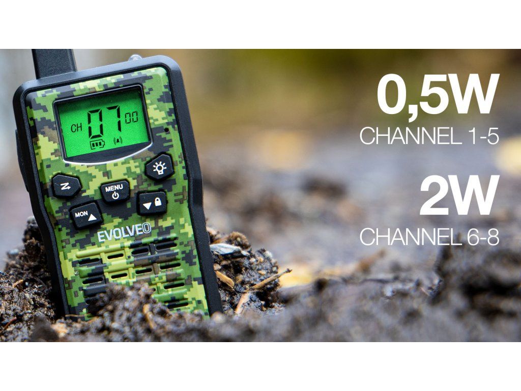 Sada vysílaček, které dokáží pracovat v režimu PMR 446 (446MHz) s výkonem 0,5W, ale též na frekvenci 448MHz s výkonem 2W. S výkonnou baterii s kapacitou 1300mAh se můžete vydat i na vícedenní výpravu a stále budete ve spojení. Pro komunikaci je 8 dostupných kanálů, z nichž každý je možné dále provozovat se 121 kódy (38 kódů CTCSS a 83 kódů DCS). Kódy se používají pro odfiltrování cizích účastníků vysílajících na stejném kanále. Walkie talkie obsahuje také funkci monitorování kanálu, údaje jsou zobrazovány na velkém a přehledném displeji.