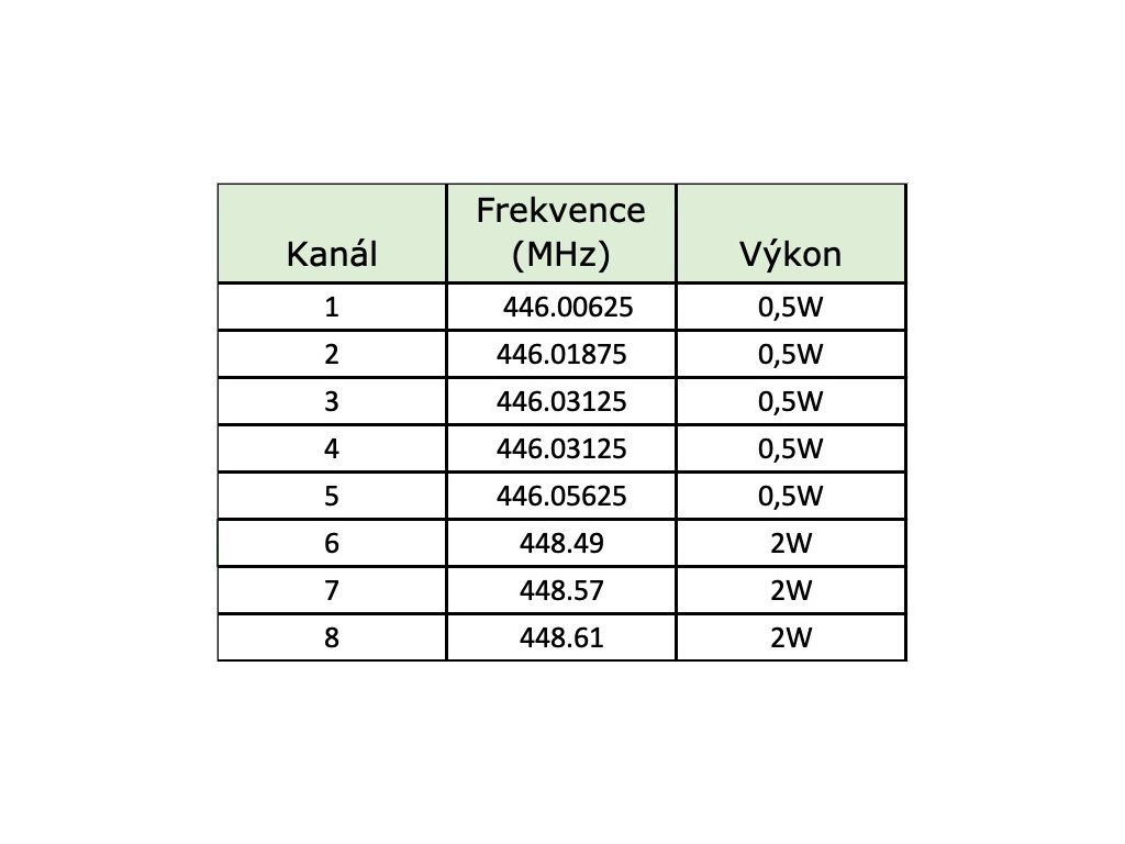 - 5 kanálů, frekvence 446MHz, výkon 0,5W, dosah až 9km